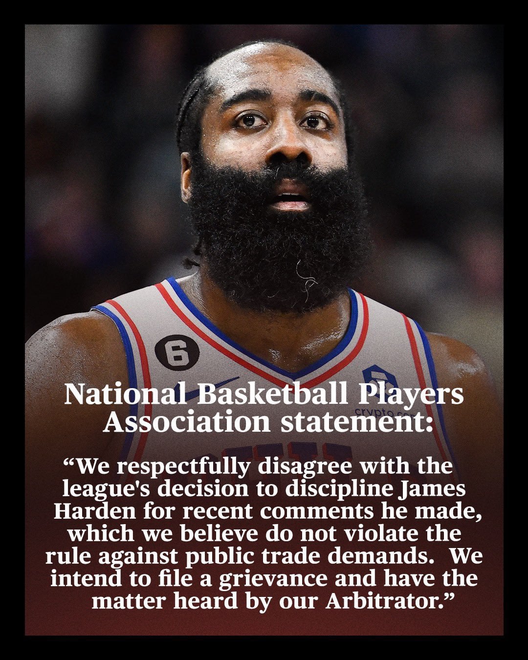 [Wojnarowski] The NBPA will file a grievance to an arbitrator disputing NBA’s $100K fine on Philadelphia’s James Harden and league’s assertion that his recent statements violated collective bargaining agreement rules against public trade demands.