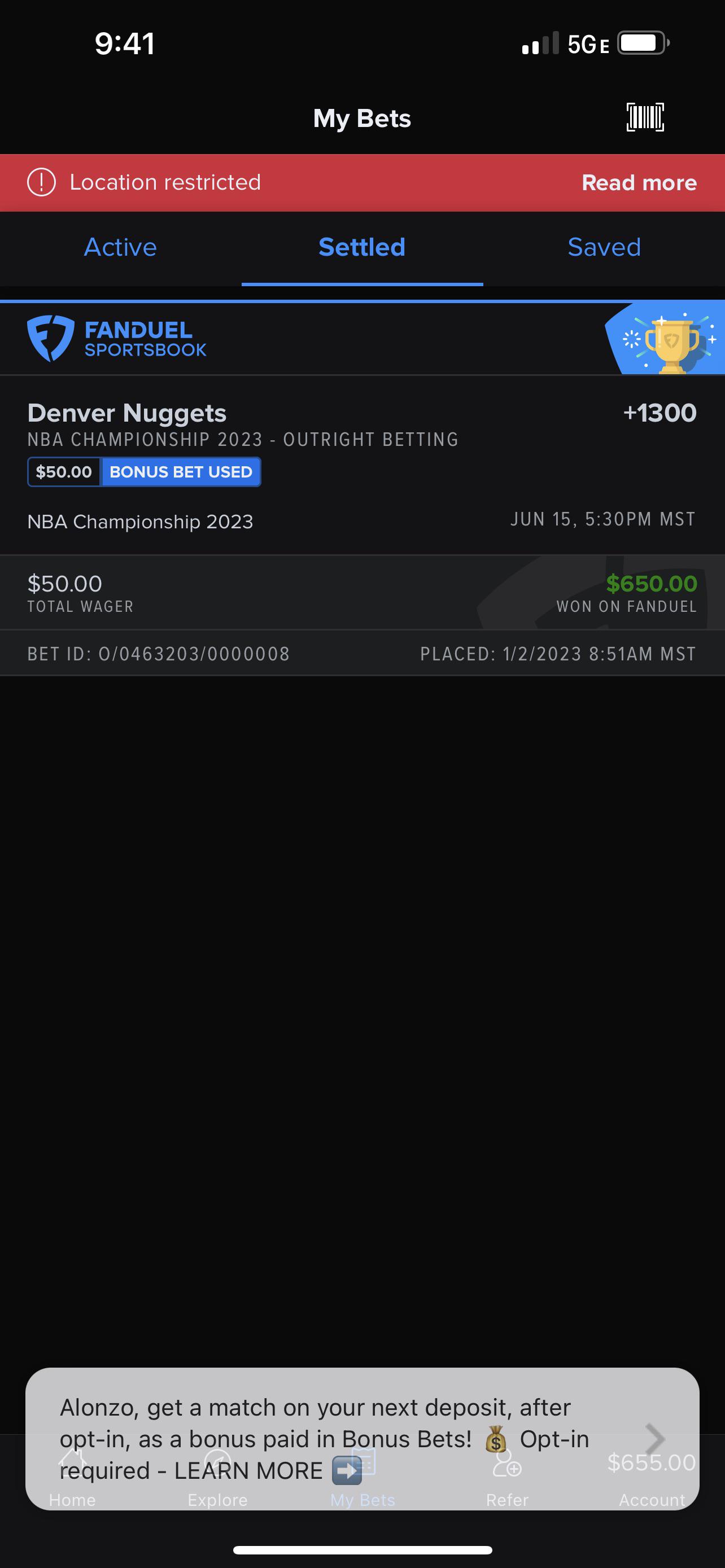 I went to Arizona for a few months for work where you do sports betting and placed this bet in January, I went back to California where sports betting is still illegal and absolutely forgot about it until I logged in yesterday to check on a different bet I had forgot about. That bet was for MVP I had selected Jokic.