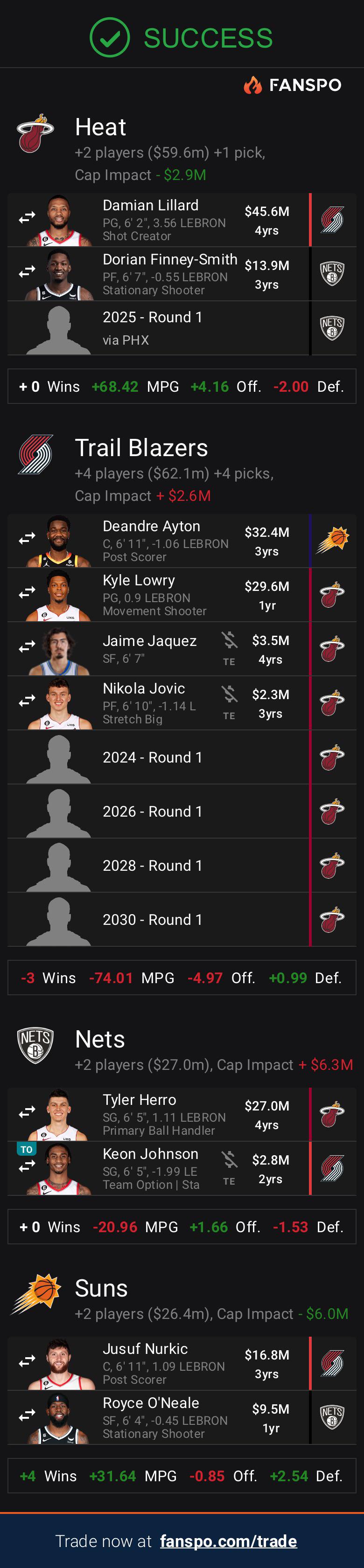 JJJ, Jovic, and Herro plus all those picks?!?!?!? Nah. That’s waaaaaay too much. Rather run it back and trust in Herro. Let the Portland deal with a disgruntled star.