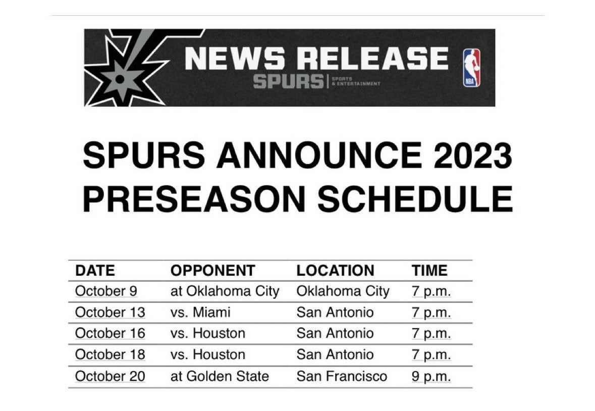 Spurs preseason schedule is out! by missilepom San Antonio SpursSouthwest DivisionWestern Conference Prev Post Should the Celtics Sign Free Agent TJ Warren? August 30, 2023 Next Post Rob Parker – Milwaukee Bucks Should Quietly Make It Known that Giannis is Available August 30, 2023 1 Comment missilepom 2 years ago only 40 more days till Spurs basketballWrite A CommentYou must be logged in to post a comment.