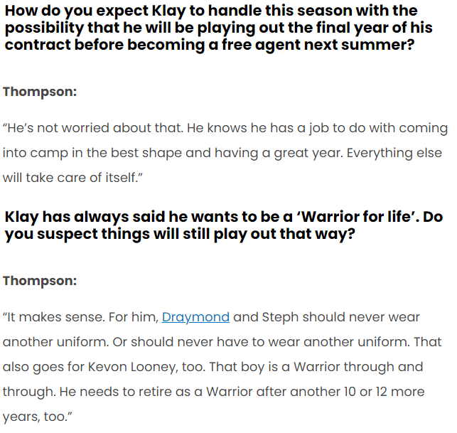 Mychal Thompson: “It makes sense. For Klay, Draymond and Steph should never wear another uniform. Or should never have to wear another uniform. That also goes for Kevon Looney, too. That boy is a Warrior through and through. He needs to retire as a Warrior after another 10 or 12 more years, too.”
