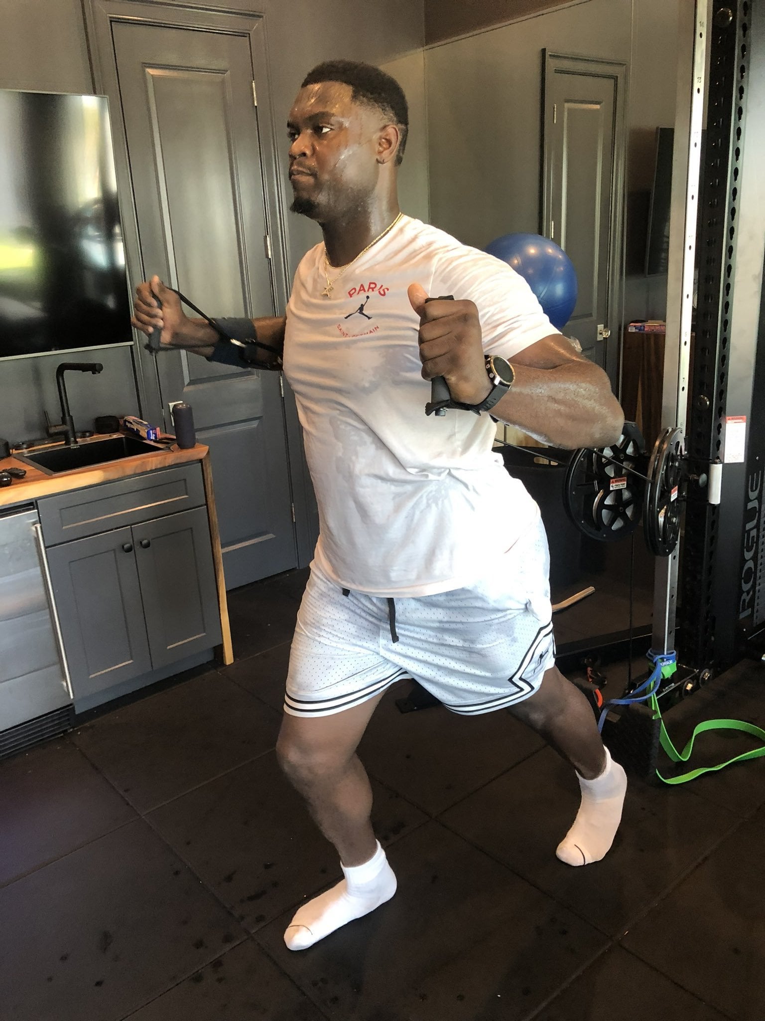 Can they not afford some floor padding at that gym? He shouldn’t have to work out on tile.