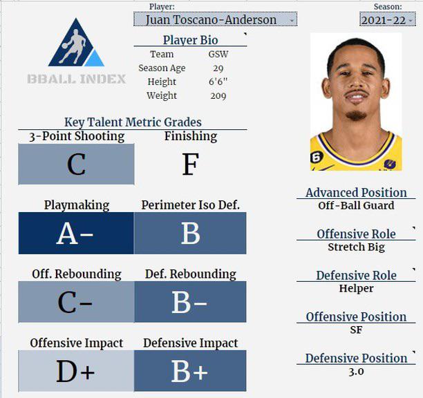 Juan Toscano Anderson 2022-2023 Talent Grade Metrics (from Basketball Index) by ImTheBestNerd Golden State WarriorsPacific DivisionWestern Conference Prev Post Can anyone help me identify this signature? September 1, 2023 Next Post Bruce Bochy on Playing in September | Rangers Live September 1, 2023 4 Comments nghbrhd_slackr87 3 years ago These BBindex grades…  …and I love JTA. Foxisdabest 3 years ago He can be a decent regular season bench guy. Had good moments that had us rooting for him and happy he was exceeding in his role for a few games. sprinkles5000 3 years ago in summary, dubs should find another player who impact both sides of the court. Bahamut_Prime 3 years ago I think everyone agrees that if you are ever signing this guy, it’s not because you expect him to drop 15 a night and get 20 rebounds or something. (Though if he was playing us instead, the due might just drop 50) But JTA is a good glue guy with the advabtage of knowing how to run GSW/Kerr plays like he did when he was low key subbing for Green. Write A CommentYou must be logged in to post a comment.