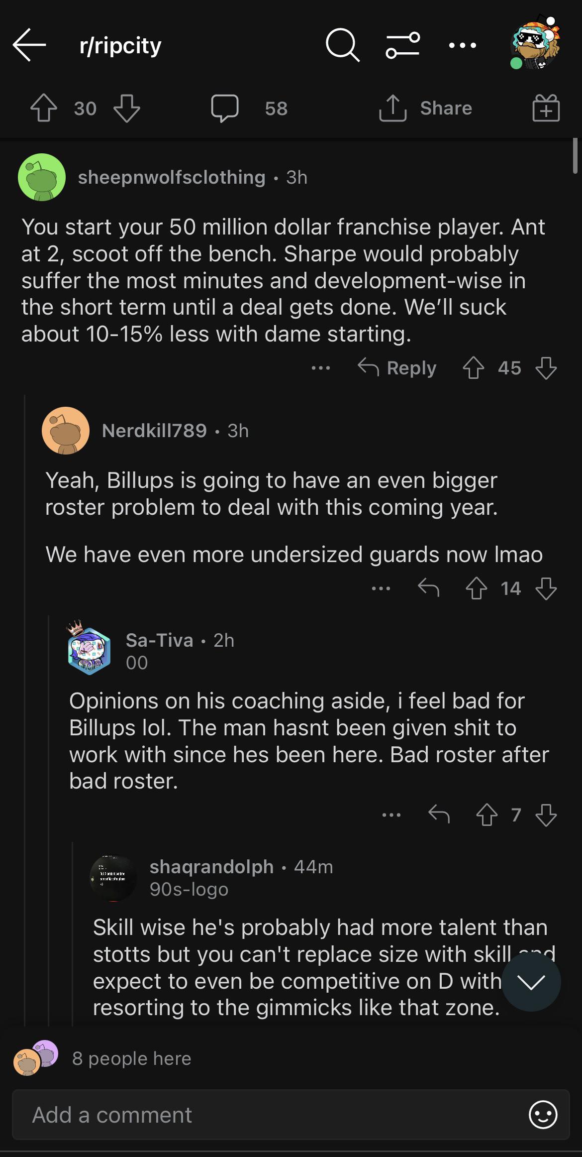 It makes no sense. Do u think Scoot will be thrilled to come off the bench? He wants to be a star. He wants to win rookie of the year. Coming of the bench will make that harder for him. Not to mention it will stump his progress. Not to mention the risk of dame getting hurt. They are gonna have dame and simons out there 30+ mins a night how many mins does that leave scoot and sharpe? It makes no sense