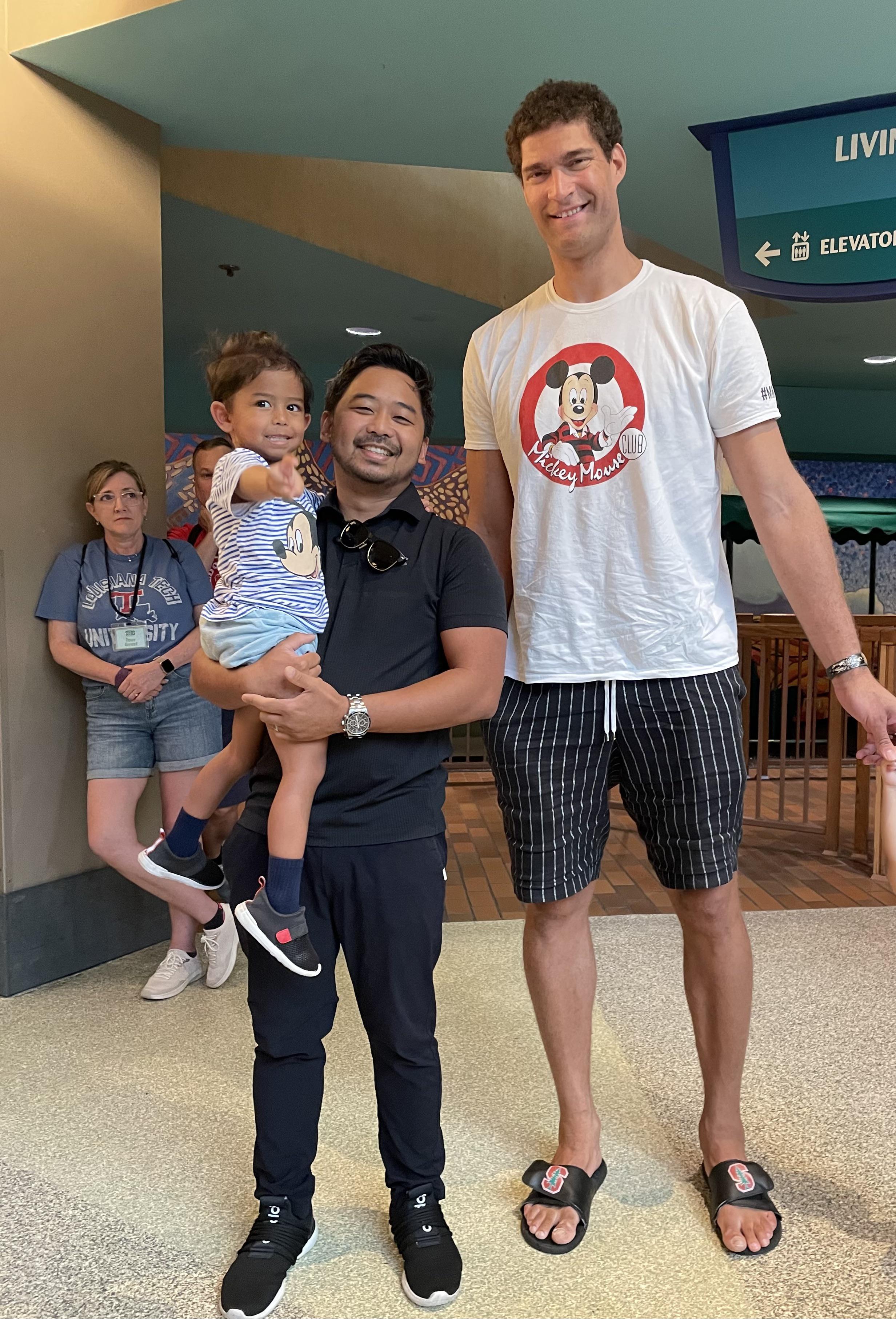 Sat a few rows behind him on a ride. Wife insisted it was him and i kept blowing her off since he seemed like just a regular guy taking pictures of the attractions and all. He also looks so much leaner than from his time at the Nets. As soon as i saw the Stanford sandals thats when i was like yeah that’s definitely him. Approached him and ask for a pic and congratulated him on winning a ring. Asked him to come back to Brooklyn too 😂