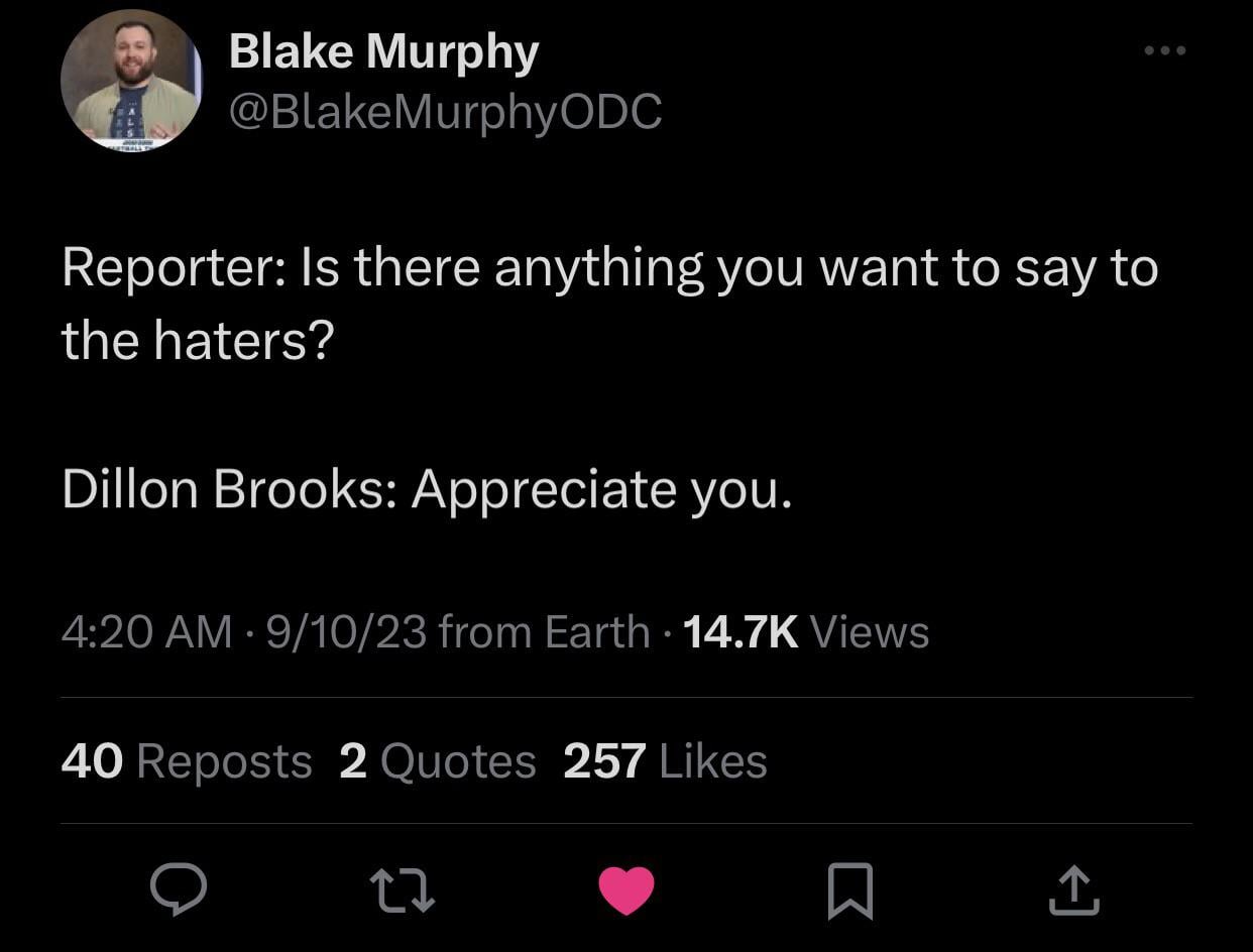 King Brooks π by _s0lace_ Houston RocketsSouthwest DivisionWestern Conference Prev Post Battle For Banner 18: Will Boston Celtics battle historical foe in 2024 Finals? September 10, 2023 Next Post Kid got potential September 10, 2023 3 Comments Pizzachomper874 2 years ago I sincerely hope bro gets a huge round of applause in the home opener Forward_Society91 2 years ago If you ainβt got no haters you ainβt poppin Anibunnymilli 2 years ago Goat BrooksWrite A CommentYou must be logged in to post a comment.