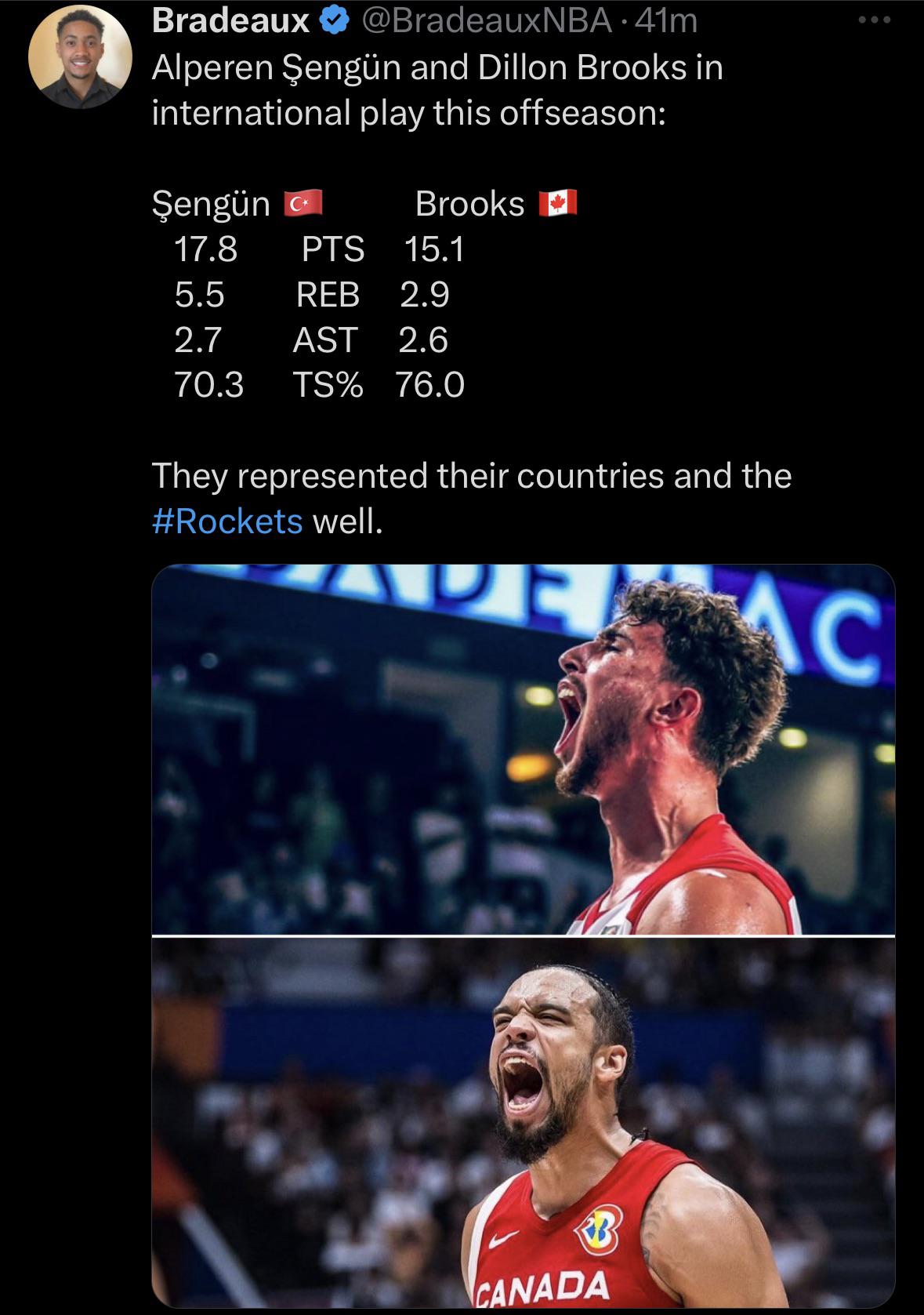 https://x.com/bradeauxnba/status/1701239049971741073 by ST012Mi Houston RocketsSouthwest DivisionWestern Conference Prev Post MY GOD! JOE MAZZULLA CONFIRMS! ROBERT WILLIAMS III UPDATED! BOSTON CELTICS NEWS TODAY! September 11, 2023 Next Post Gilbert Arenas on 2024 Olympics: “Y’all see what y’all did” Y’all f[}ed up. Bron coming” September 11, 2023 2 Comments xDoga 2 years ago Sengun played mostly as a 4. Pizzachomper874 2 years ago Brooks shot 76 TS%? Holy shit😂Write A CommentYou must be logged in to post a comment.