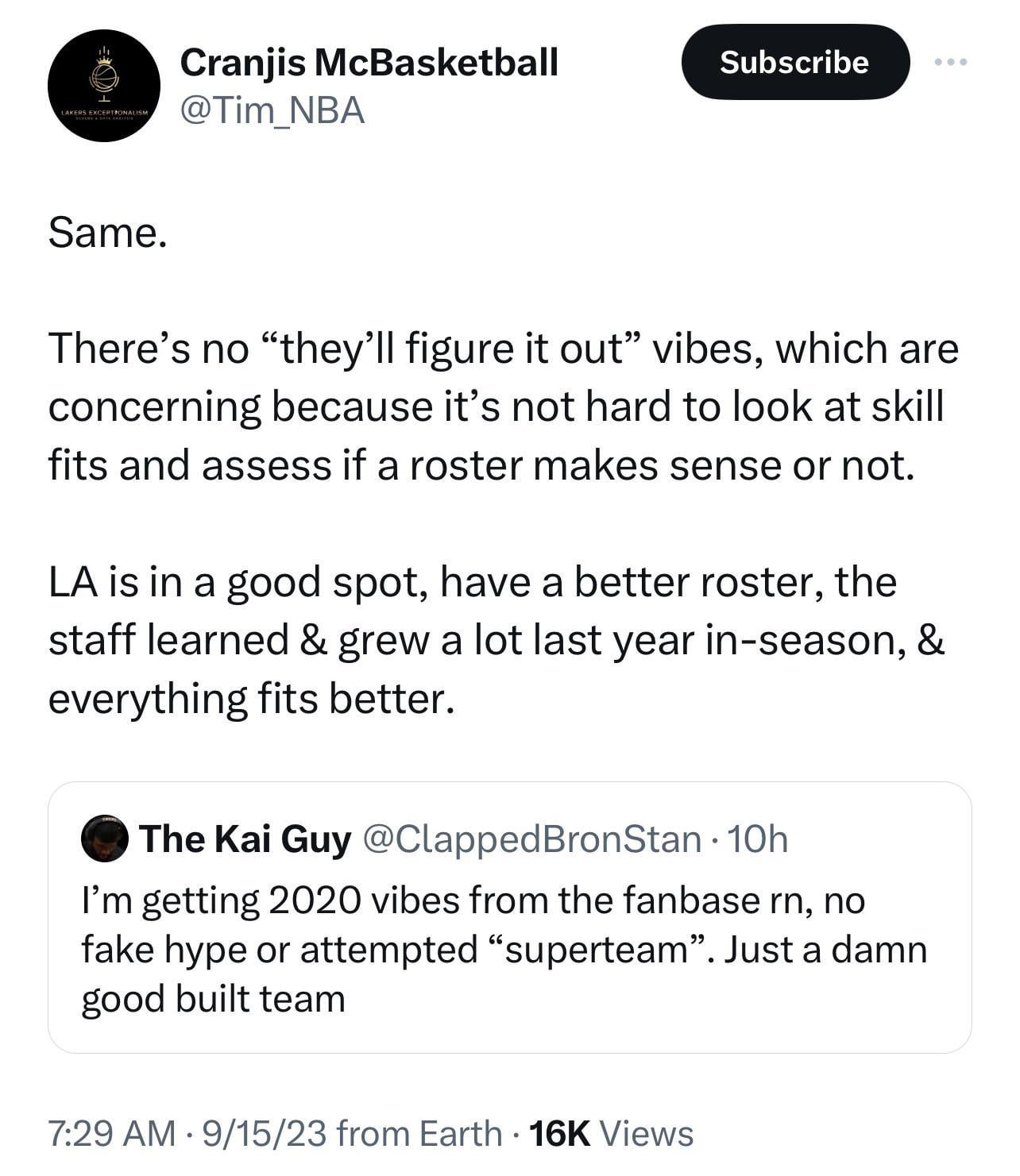 Man people are really underestimating the chemistry aspect of this. I’ve been watching basketball some 30 years now and it’s just easy to tell when a team *fits* and when it doesn’t. Dlo, Reaves, Rui, Bron, AD, and Vando just works.