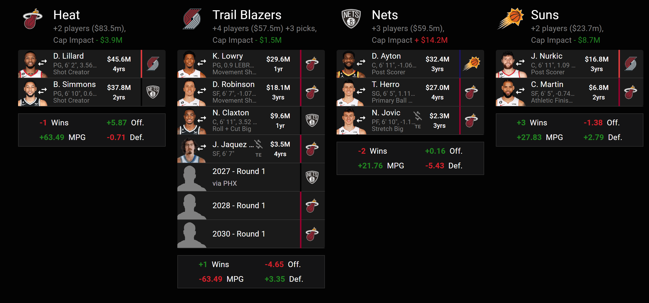 RoseGardenForever 2 years ago The nets part is ridiculous, they get off Simmons and get Ayton, Jovic, and Herro while only giving up claxton and a first.No reason for Miami to take Simmons in this, I think Portland wouldn’t want to take on that much bad money either.Also that’s a super small return for Ayton, his value to fans is low but he’s still worth more than this to Phoenix