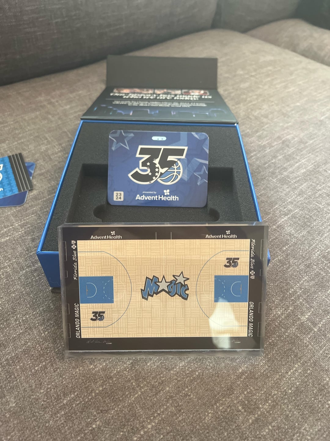 This seasons loyal blue gift came in today. The box played the Orlando Magic Theme Song when opened and included a glass paperweight of the court and member cards.