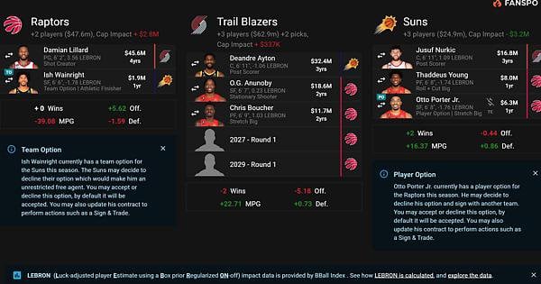 Portland, gets a great forward/C rotation with OG Grant Ayton they have young guards and an unprotected Raps pick is attractive.