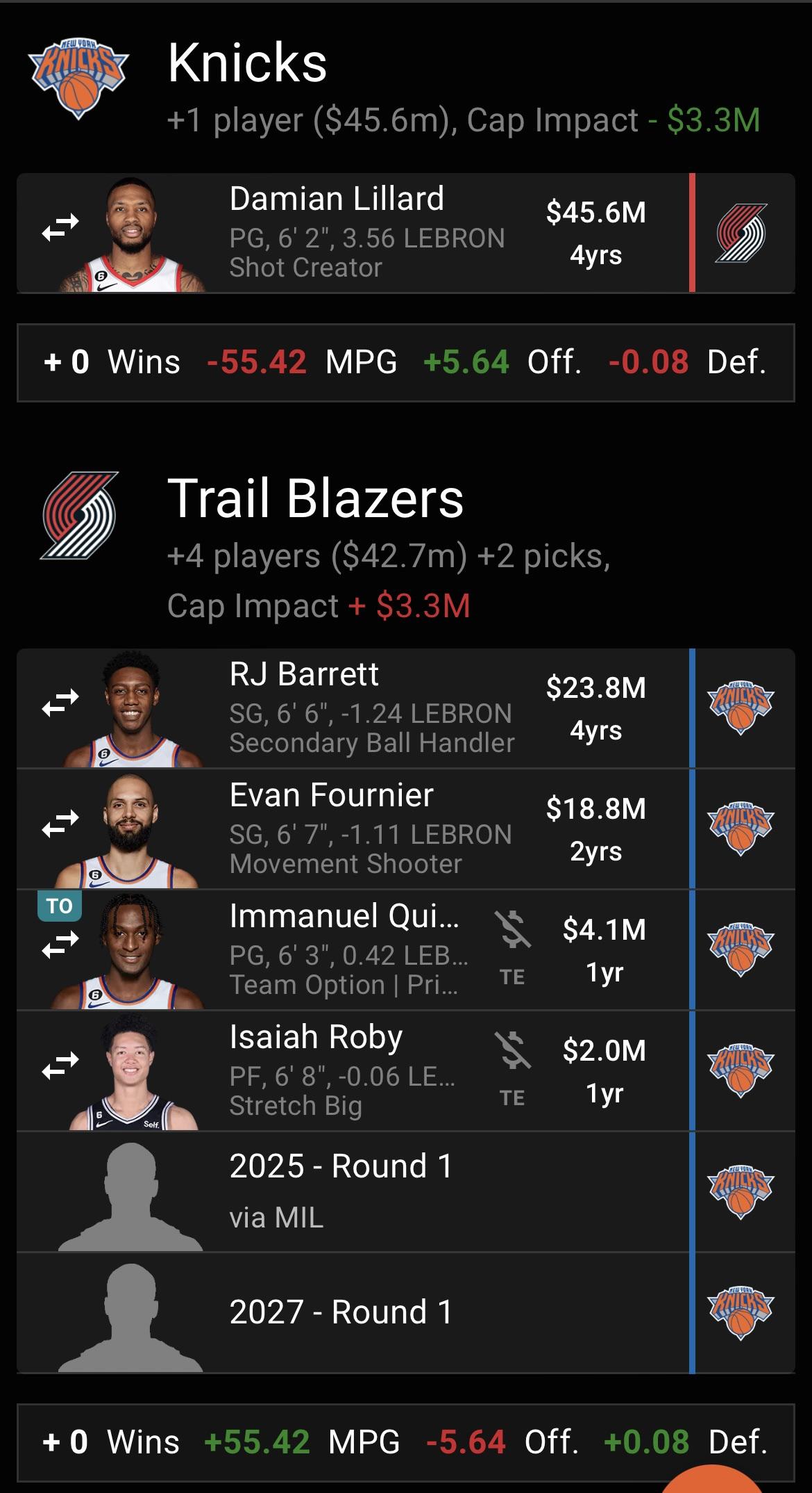 Knicks-in-7 2 years ago I can’t lie I would love to see this team roll out in MSG.Maybe switch the bucks pick for 2029 Knicks first so we can use that Bucks pick as leverage in the next trade that really ascends us 👀