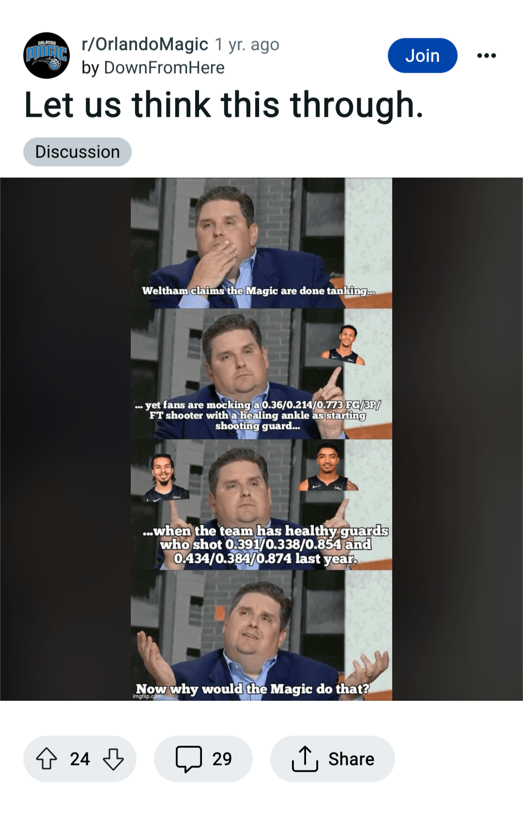 The Suggs delusion is so wild to me. His hustle and defense is *fantastic* but he can’t shoot, he can’t create his own shot off the dribble, and he can’t facilitate a half court offense (when Fultz and Cole were hurt we had Franz and Paolo bringing the ball down for Christ’s sake). This sub complained every single year about WeltHam drafting defense first/no offense players and yet even though Suggs fits that trend perfectly everyone is unreasonably optimistic about his offense game. Very confusing.