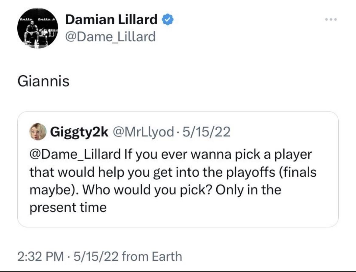 I think the only player in the league I would want to pair with Giannis more than Dame is Steph…