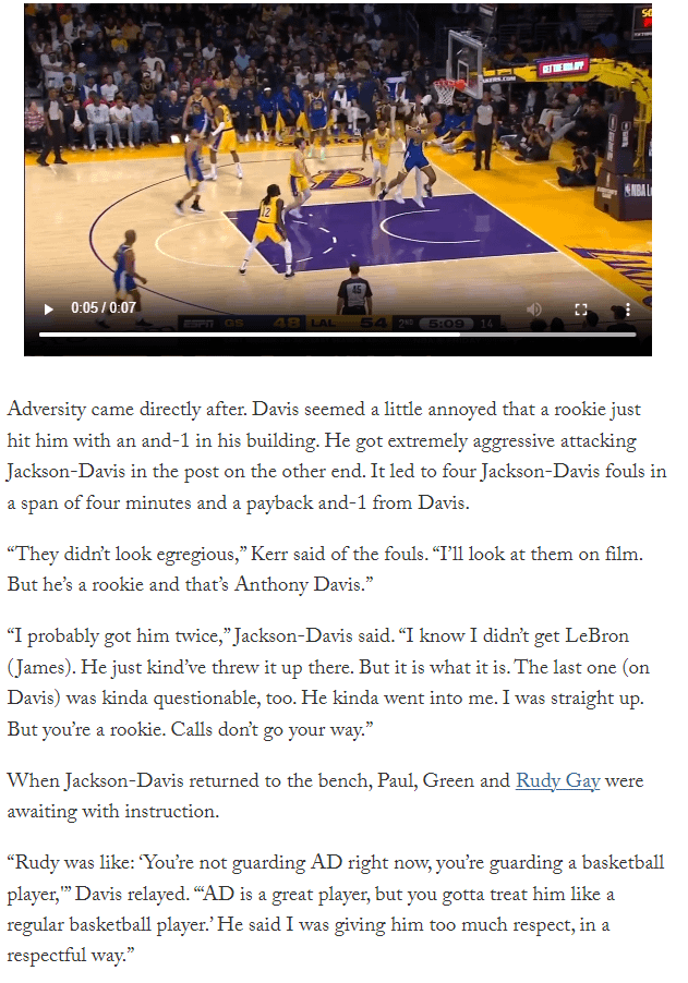Trayce Jackson-Davis on the 4 Quick Fouls (via Slater): “I probably got AD twice. I know I didn’t get LeBron. The last one was kinda questionable too. But you’re a rookie. Calls don’t go your way” When TJD returned to the bench, Paul, Green & Rudy Gay were awaiting with instruction