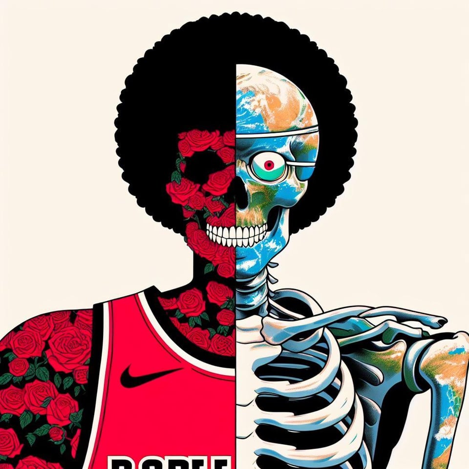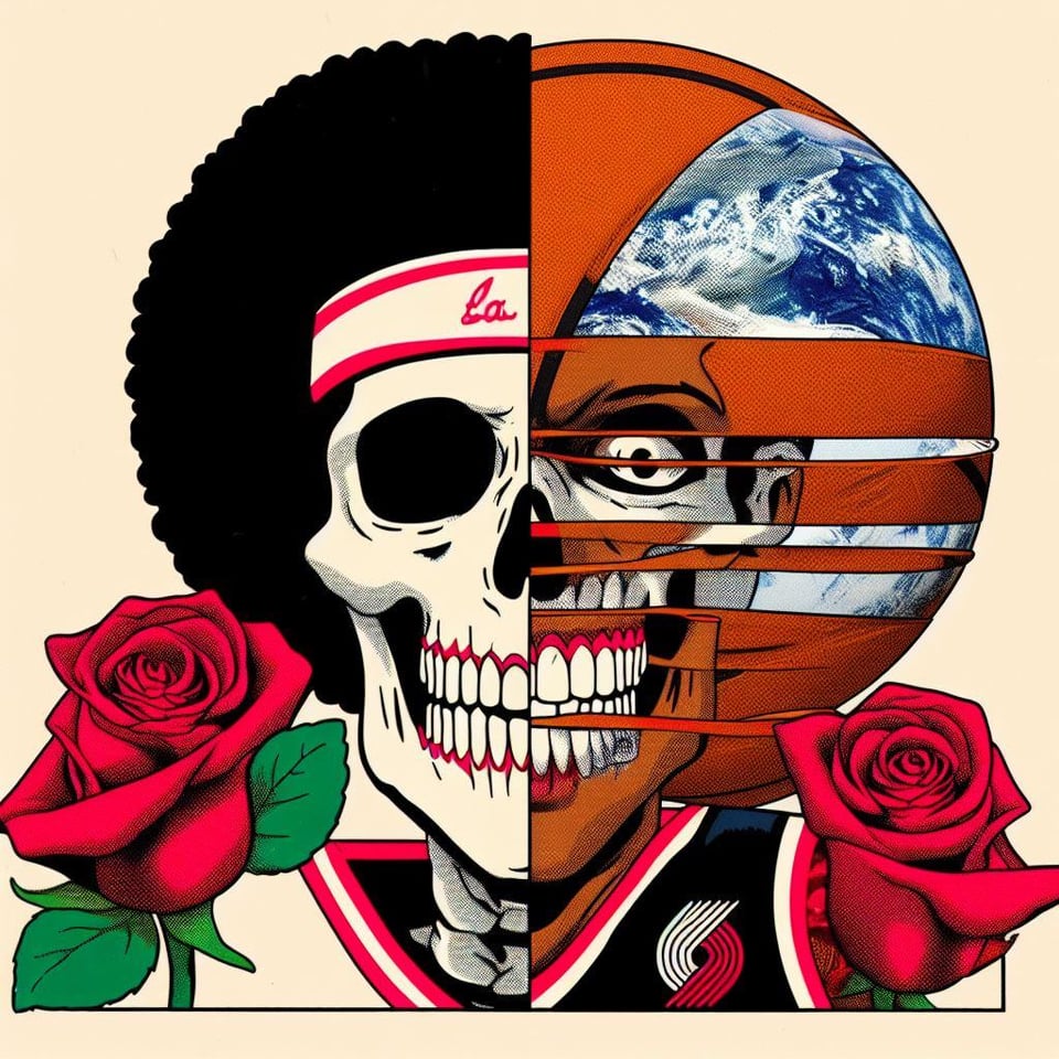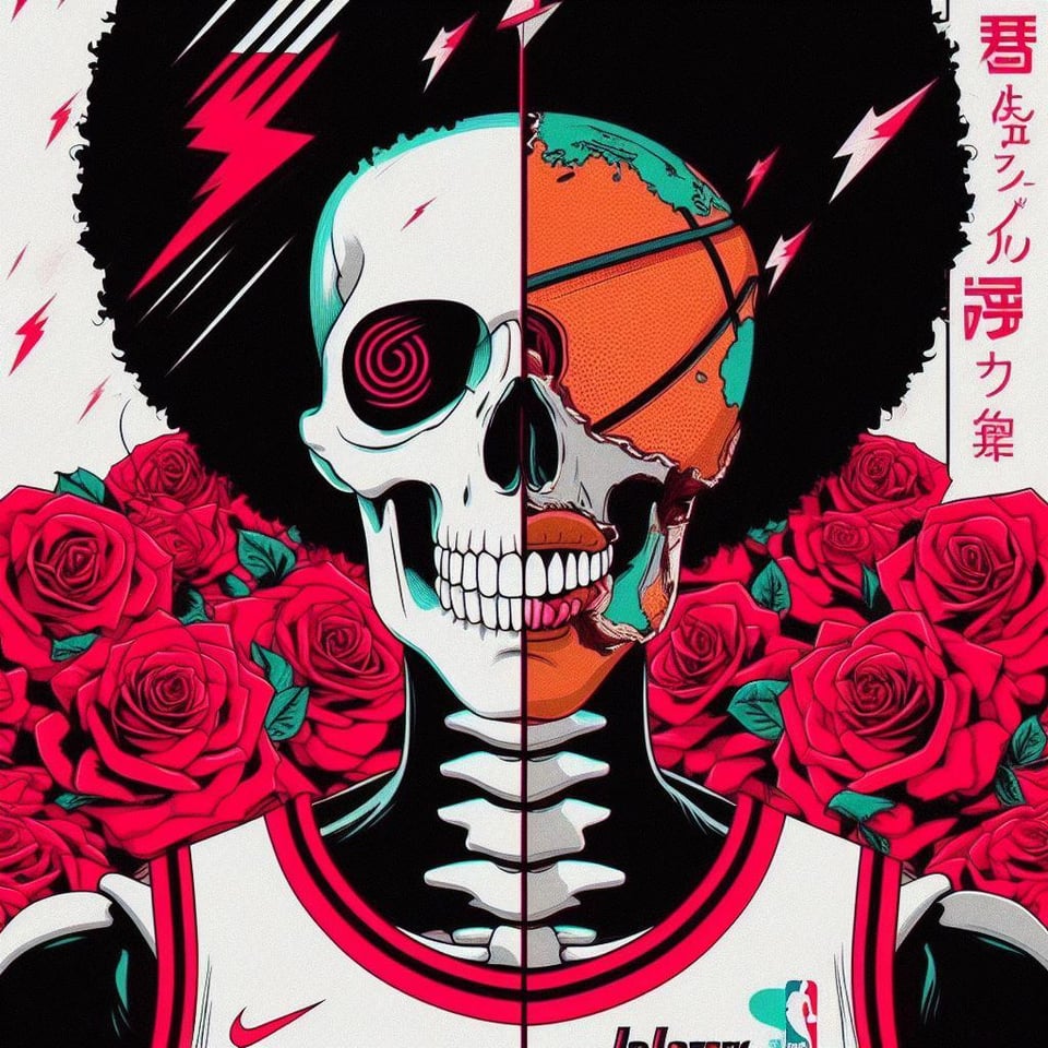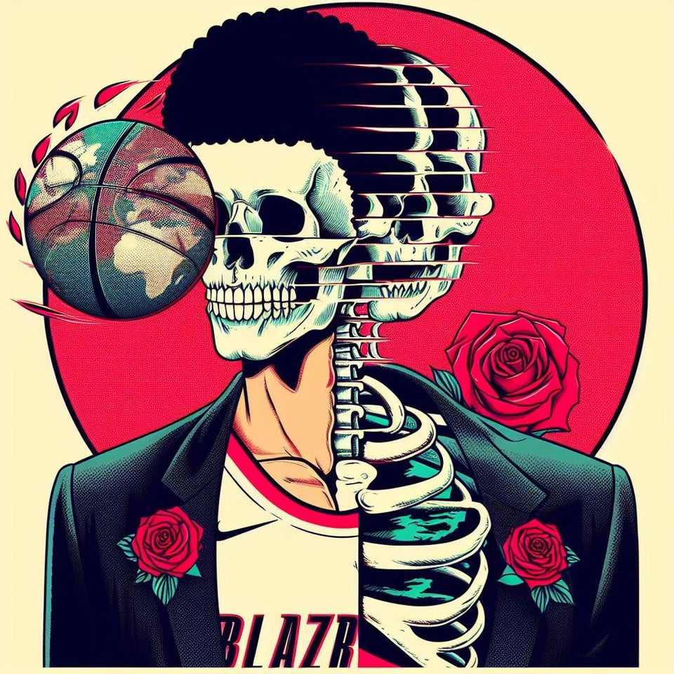 “an image with rip effects of a skeleton with diamond bones dressed as a portland trailblazer player. with sliced nba basketball in 2 halves. picture rows on the trailblazer are invisible and reveal earth, vintage junji ito anime style with two faces. one face is a blazer logo. roses. afros. no letters or words. visual aesthetics. symetrical”