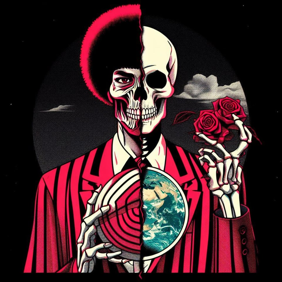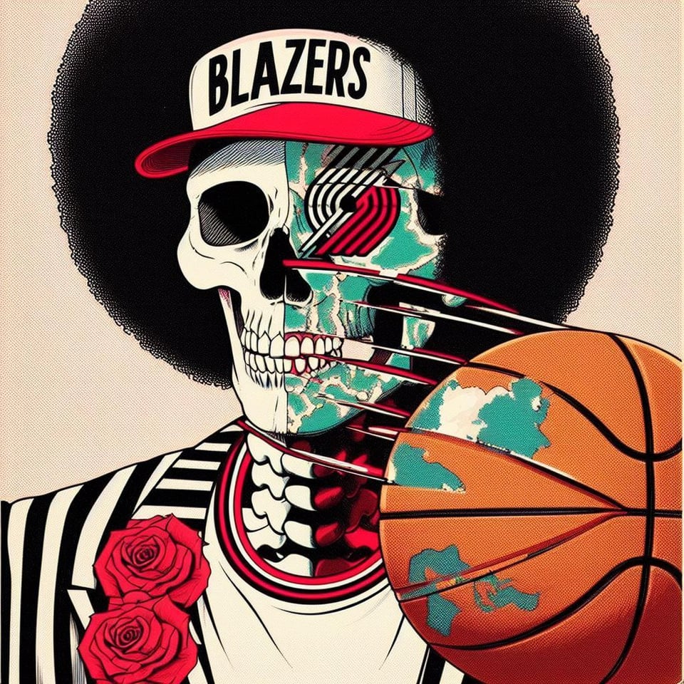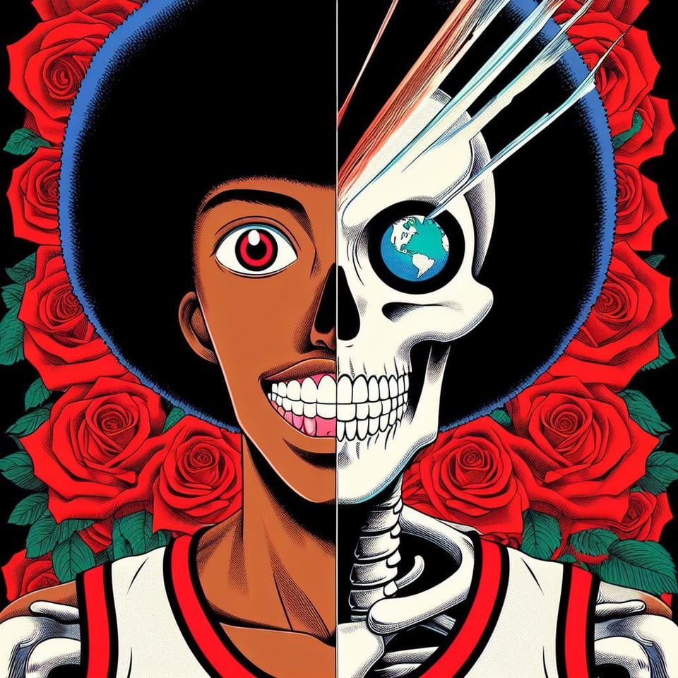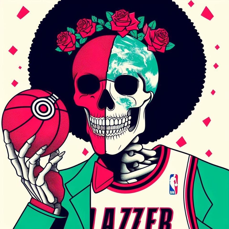 “an image with rip effects of a skeleton with diamond bones dressed as a portland trailblazer player. with sliced nba basketball in 2 halves. picture rows on the trailblazer are invisible and reveal earth, vintage junji ito anime style with two faces. one face is a blazer logo. roses. afros. no letters or words. visual aesthetics. symetrical”