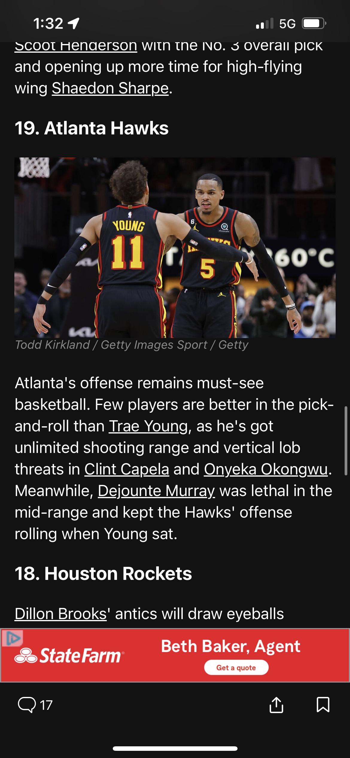 Bogdan Bogdanovic can swing games with his shooting; how often will Snyder play him alongside both Young and Murray — or (gulp) even close games with Bogdanovic in place of one of them? Jalen Johnson is a blur of productive activity. If his 3-pointer comes around, watch out. It is car-crash riveting watching Garrison Mathews fling himself into picks hoping to draw illegal screen calls.