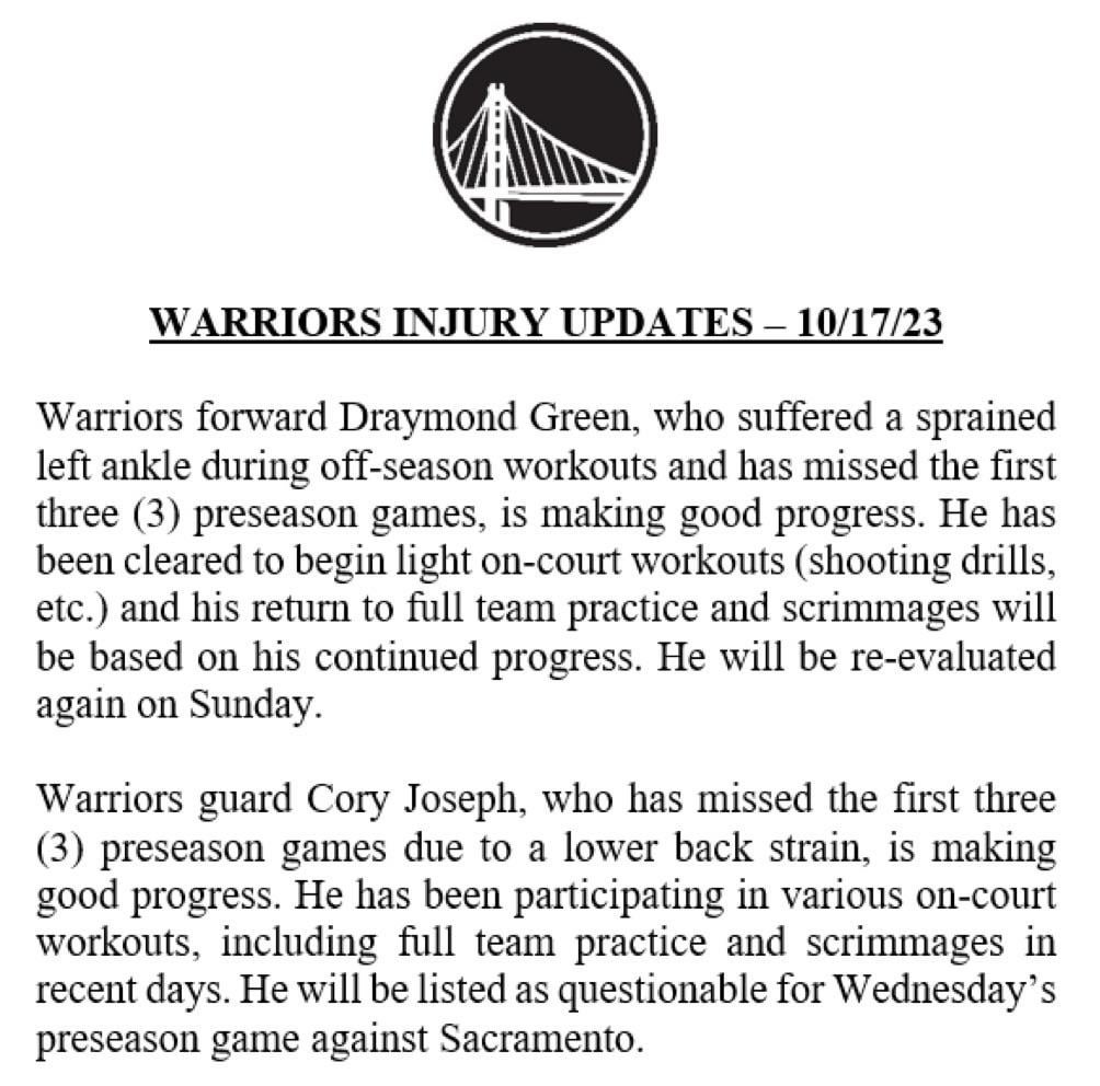 Interesting write up for Draymond, particularly “he has been cleared to begin light on-court workouts (shooting drills, etc.)” given we’ve seen [video](https://x.com/cjholmes22/status/1712893969062052033?s=46&t=SBW3XJi-eEDBr6FtvDfngg) of him doing that already and going through a full individual workout (including shooting and other drills) after shootaround and prior to the 2nd preseason game in LA which was 4 days ago lol but hey, happy to hear he’s still on the right track.