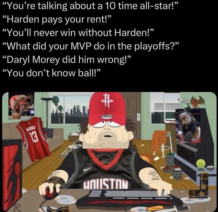 lol yeah I’m a rocket fan living in Philly so I sub to stay connected. I did not want harden back in Houston. We still have a few harden stans that hang around but most just follow him around so they won’t be your problem for much longer.