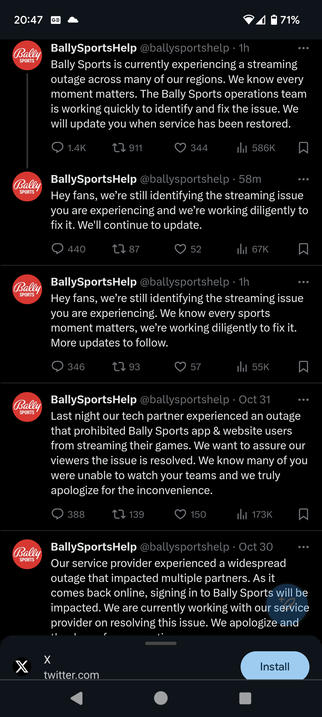 Check out their [support Twitter account ](https://twitter.com/ballysportshelp). Their posts for the past 3 days have all been saying that their service is down. This is mind boggling. The NBA might actually have to do something and take over the streaming operation. Surely there are clauses in their contract that allow the NBA/franchises to terminate without penalty if Bally can’t meet some very basic criteria. At this point, I hope Bally doesn’t recover and the NBA ends them once and for all.