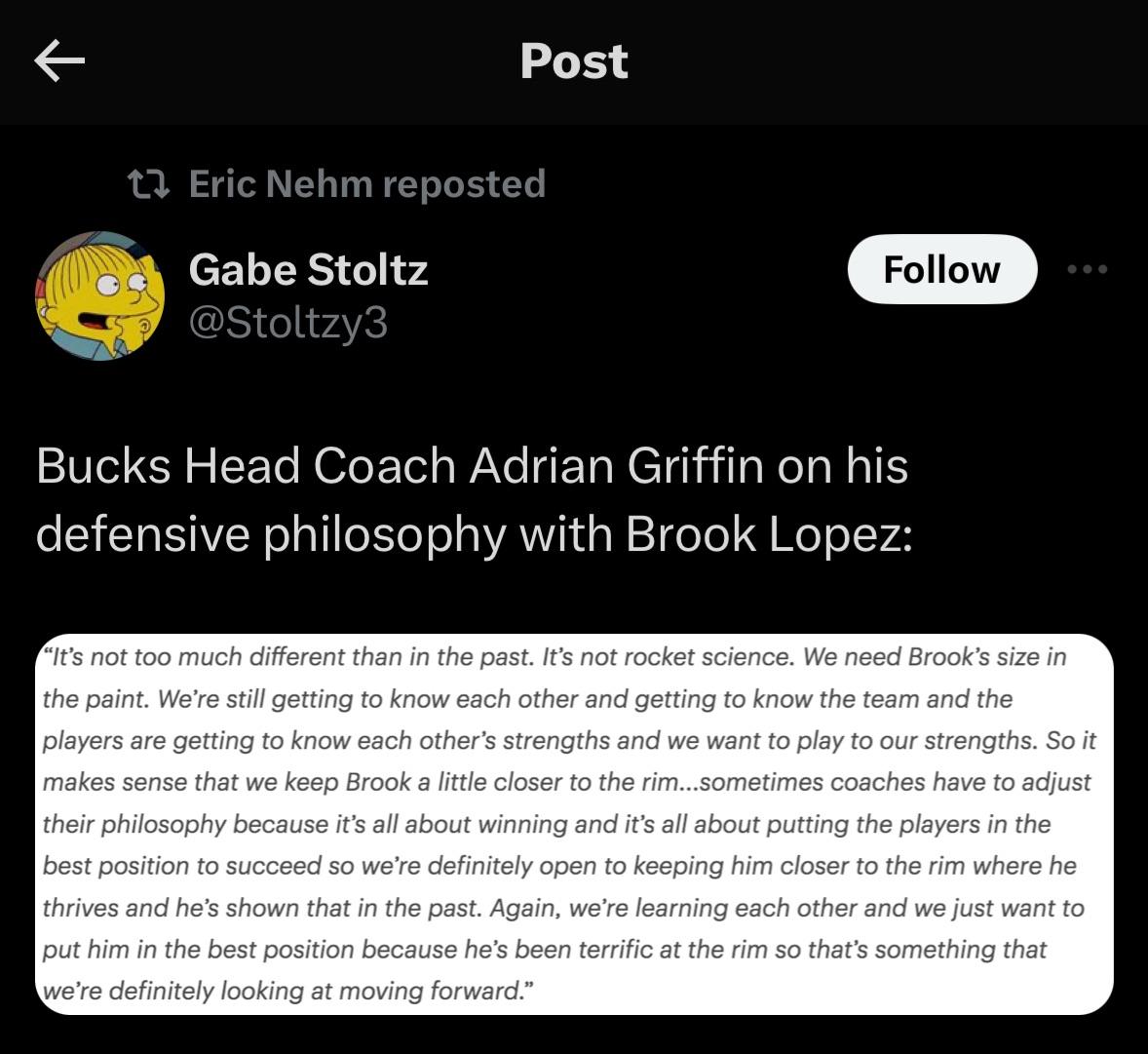 Seems like brook playing the drop worked well this game (not a shocker). I know everyone in this sub loves to overreact to everything, but personally I’m glad to have a coach who is experimenting with different philosophies and lineups. Bud’s inability to be flexible is kind of the reason everyone here shat on him… seems like people are now hating on Griff for doing the very thing that they wanted bud to do