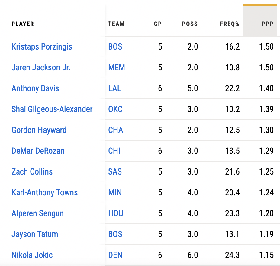 Kristaps Porzingis is THE most efficient post up player in the entire NBA so far this season. Jayson Tatum is 10th.