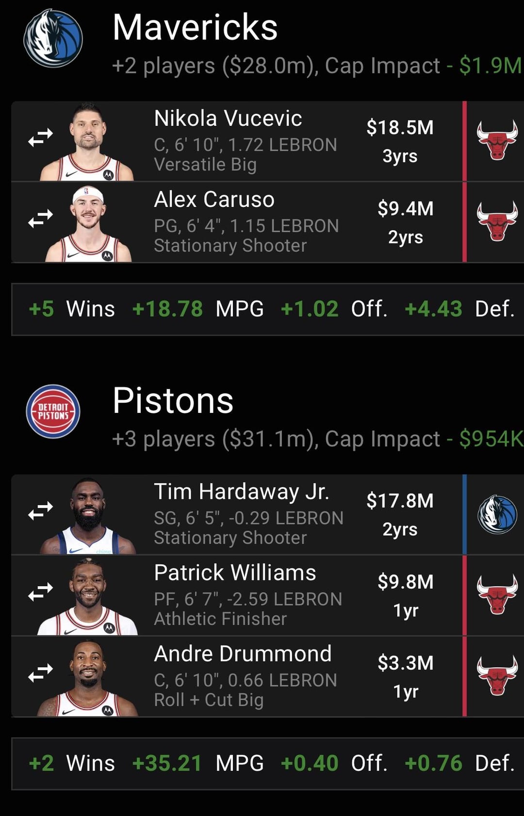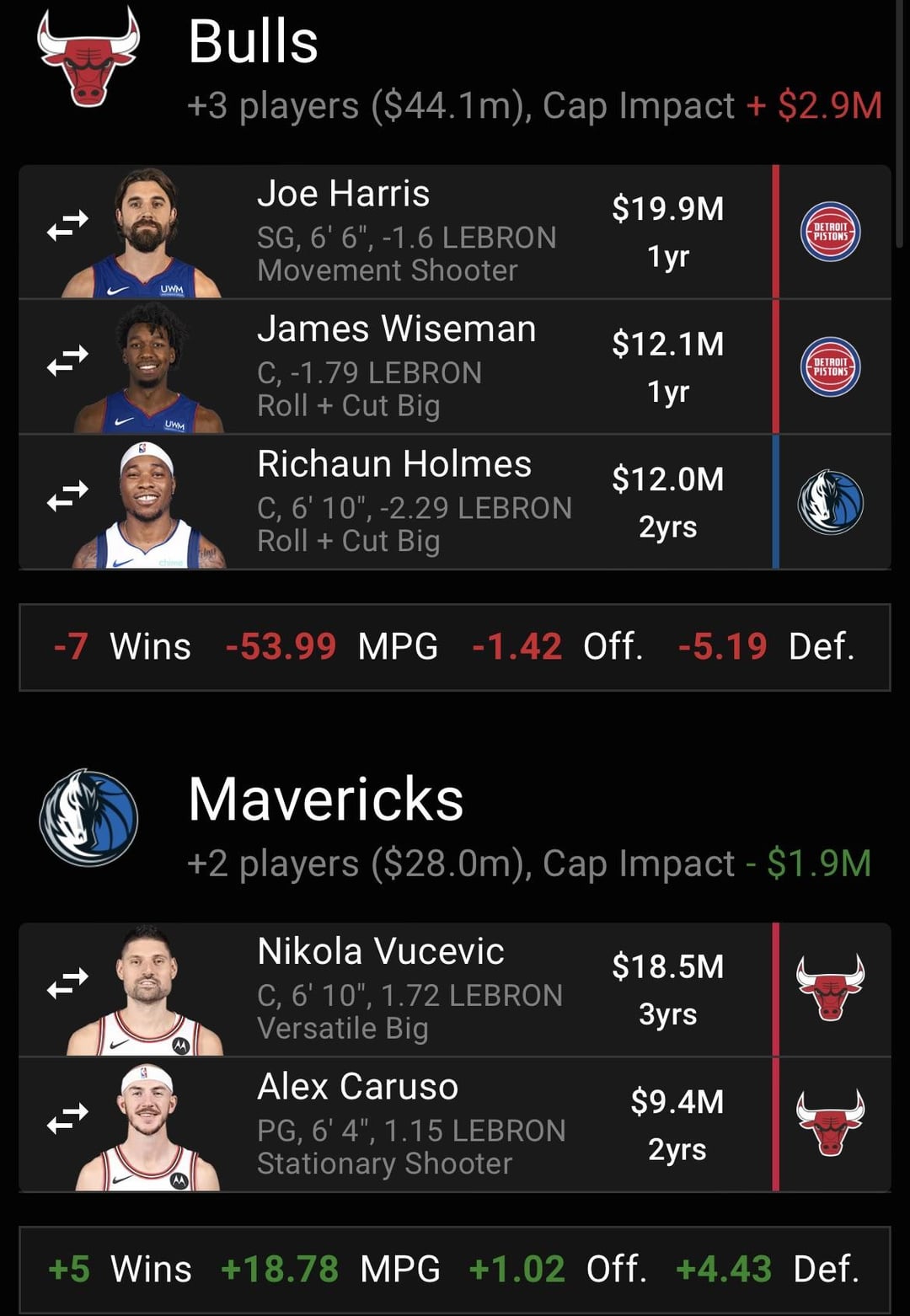 I think this helps all 3 teams. We get a good big, better rebounding and obviously better defensively. The Pistons get out of the Wiseman situation and get an upgrade over Harris. The Bulls get to start the rebuild/tank. We probably end up throwing in Hardy, maybe get Drummond. Obviously picks would be included with this. NBA picks values in trades are all over the place. At least one from the Mavs and the Piston to the Bulls.