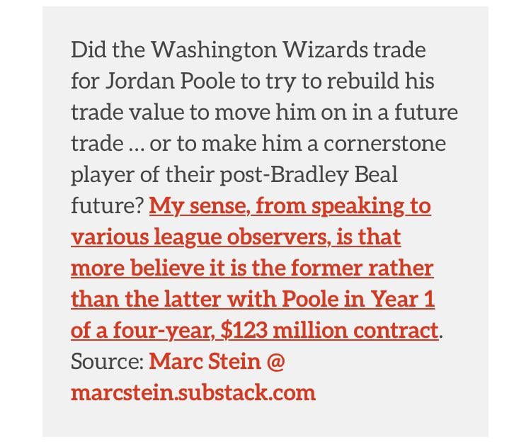 [Marc Stein] Wizards likely to move on from Jordan Poole by trade deadline or in the off-season as team officials don’t view Poole as “cornerstone material”