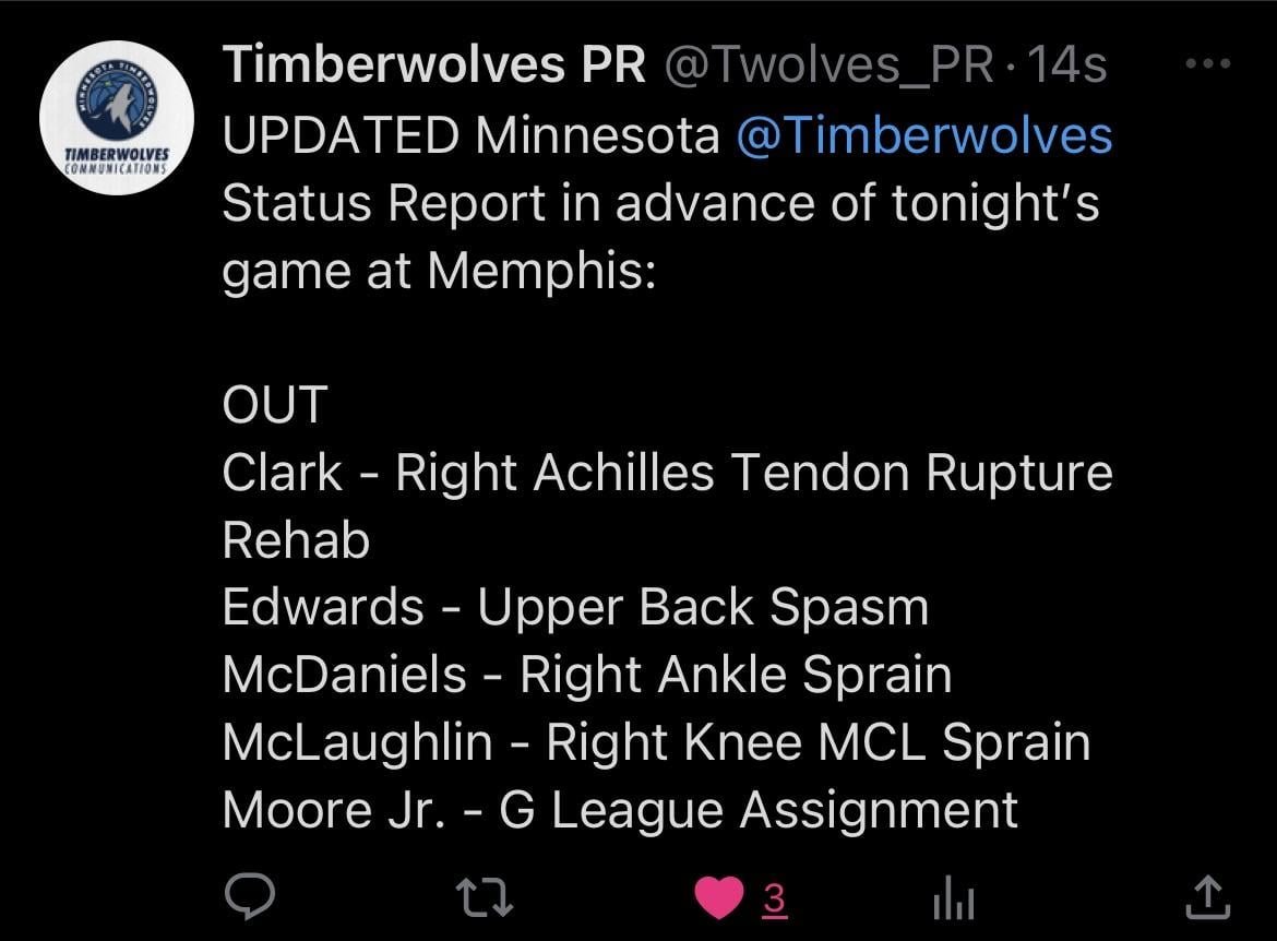 They just updated again and made him questionable. KAT has to carry the offense.