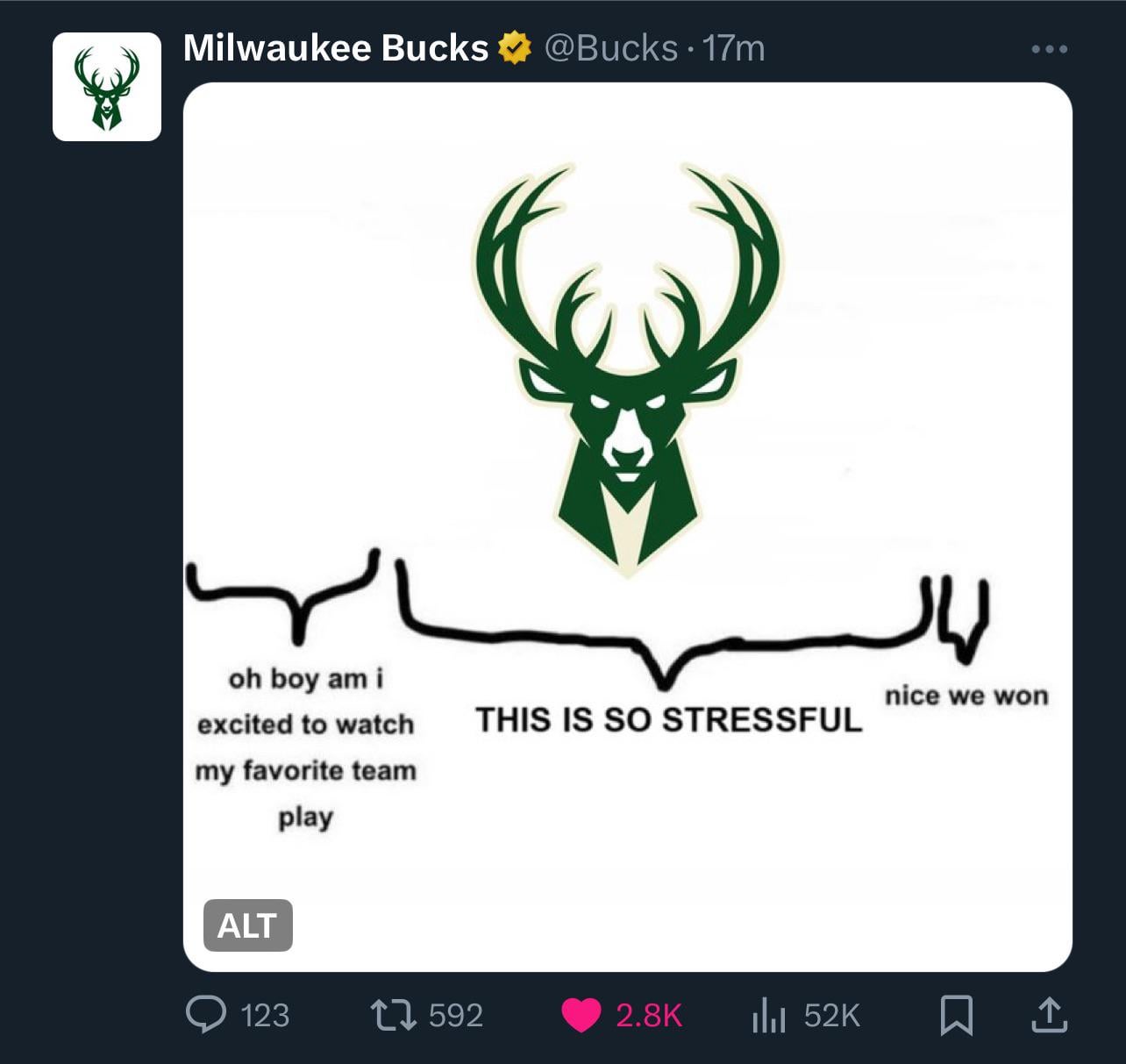 Bucks social media gets it. by WonSeoul Central DivisionEastern ConferenceMilwaukee Bucks Prev Post This angle is wild 😳 (via @clevelandcavaliers/TT) November 29, 2023 Next Post HOW did Kyrie Irving make this? 👀🤯 | #Shorts November 29, 2023 3 Comments RyanIsReady23 2 years ago That is hilarious and accurate tuatara_teeth 2 years ago this is a modification of the original meme lol… “this is so stressful” replaces “this is the worst team ever” WeefBellington24 2 years ago Thank god the self awareness is there. ​ Where is the meme with the bus and the train comin outta nowhere when you need it Write A CommentYou must be logged in to post a comment.