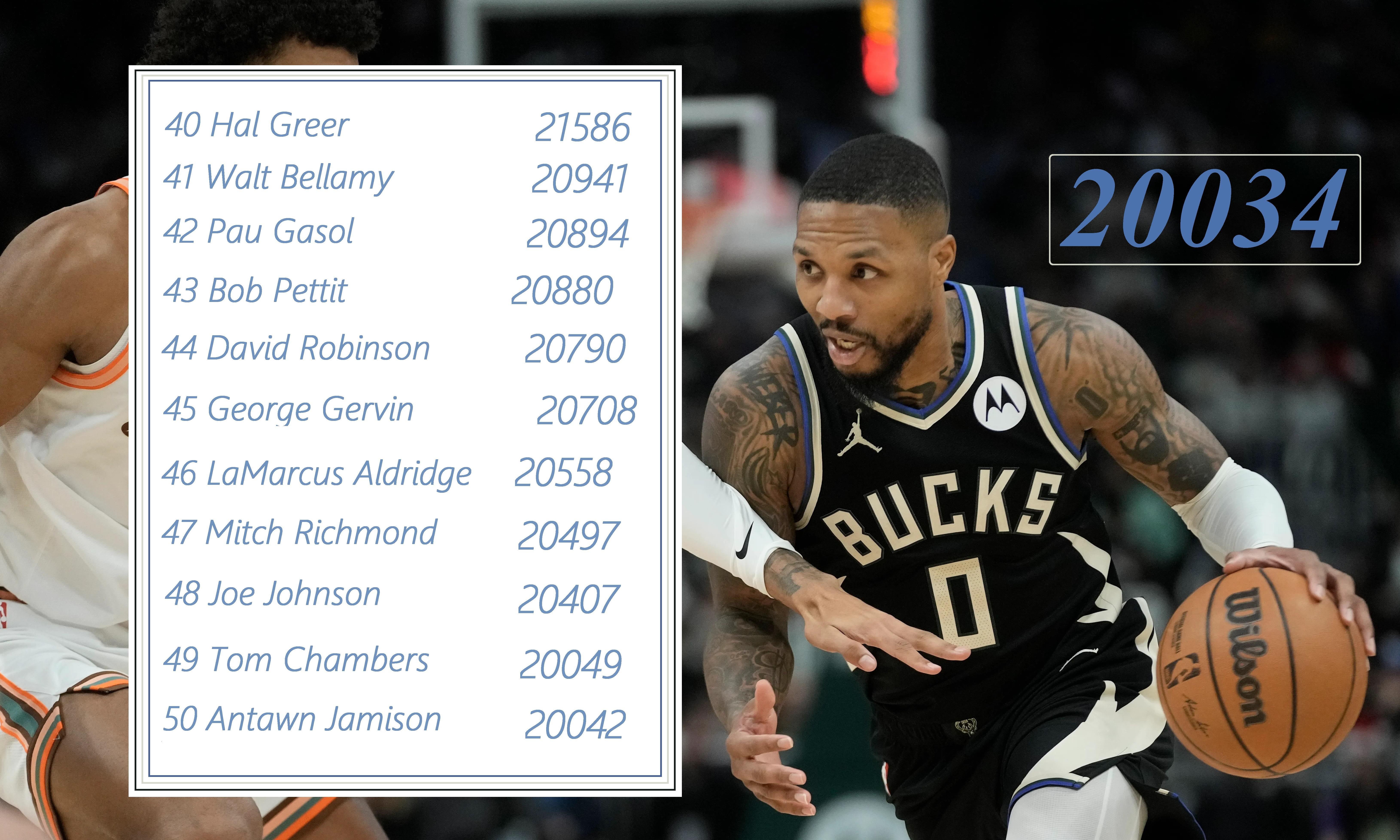 Dame approaching the top 50 All Time leaders in pointsby JPD050409 Central DivisionEastern ConferenceMilwaukee Bucks Prev Post Steph Curry’s Best “Night Night” Celebration Moments 👏 December 20, 2023 Next Post Found this mural of Dez in downtown Nashville! December 20, 2023 4 Comments JPD050409 2 years ago [Lillard becomes the 51st person in NBA history and 8th active player to reach 20,000 points in his career](https://www.nba.com/news/damian-lillard-20k-points) Uruz94 2 years ago Weird to see pau Gasol randomly there QBRisNotPasserRating 2 years ago Bob Pettit dropping 50 in a Finals game and #43 on the scoring list, that guy was underrated albertcamusjr 2 years ago Should end the season around 41st, if all goes well?Write A CommentYou must be logged in to post a comment.