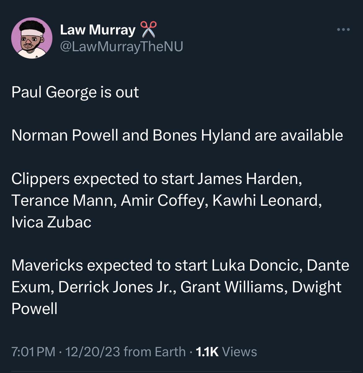 Also, PG is out for us and Irving is out for the Mavs. No excuses. Lets beat their ass.