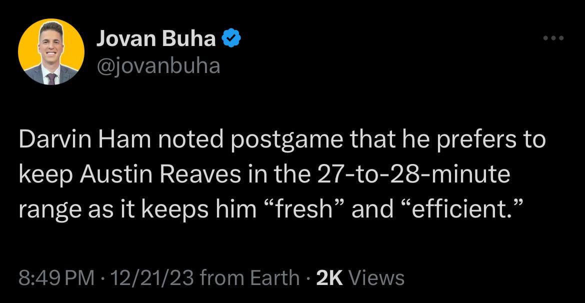 I personally think that AD, Lebron and Reaves are all being overworked this season. Lebron is only supposed to be playing about 30 minutes per game, but has never been able to from the start because the team sucks without him being on the floor. AD hasn’t had any major injuries, but he’s had several small ones which is somewhat worrisome, because he’s the only 2 way player on this team so he’s already exerting a ton of energy on both ends of the floor. Reaves is young, but has been playing basketball none stop since last season and has traveled to different countries and he often does look fatigued. I think 27-28 minutes for Reaves is doable if the team is winning in the closing minutes. D.Lo and other guys just aren’t stepping up when it matters so our 3 best players right now are all being overworked.