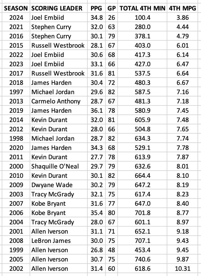 Embiid Is Averaging Just 3.86 4th quarter minutes per game, an ALL-TIME low for an NBA scoring leader by johnniehop Atlantic DivisionEastern ConferencePhiladelphia 76ers Prev Post The force is STRONG with Stephen Curry | #shorts January 3, 2024 Next Post Hornets vs Kings: Terry Rozier & Cody Martin Postgame Media Availability | 1/2/2024 January 3, 2024 4 Comments johnniehop 2 years ago note: data is from 1997-present VitaminWheat 2 years ago Shows how much of a one man army AI was coop7774 2 years ago And the highest PPG outside of Kobe & Harden wontonloup8 2 years ago Kind of hard to put up impressive numbers in the 4th when he doesn’t play half of them.Write A CommentYou must be logged in to post a comment.