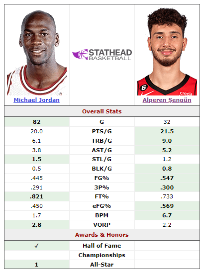 Now, some people may point out that this was Michael Jordan’s last season, with the Wizards, when he was 39 years old. And that’s true! But it’s also true that Alperen Sengun is *The* Wizard.