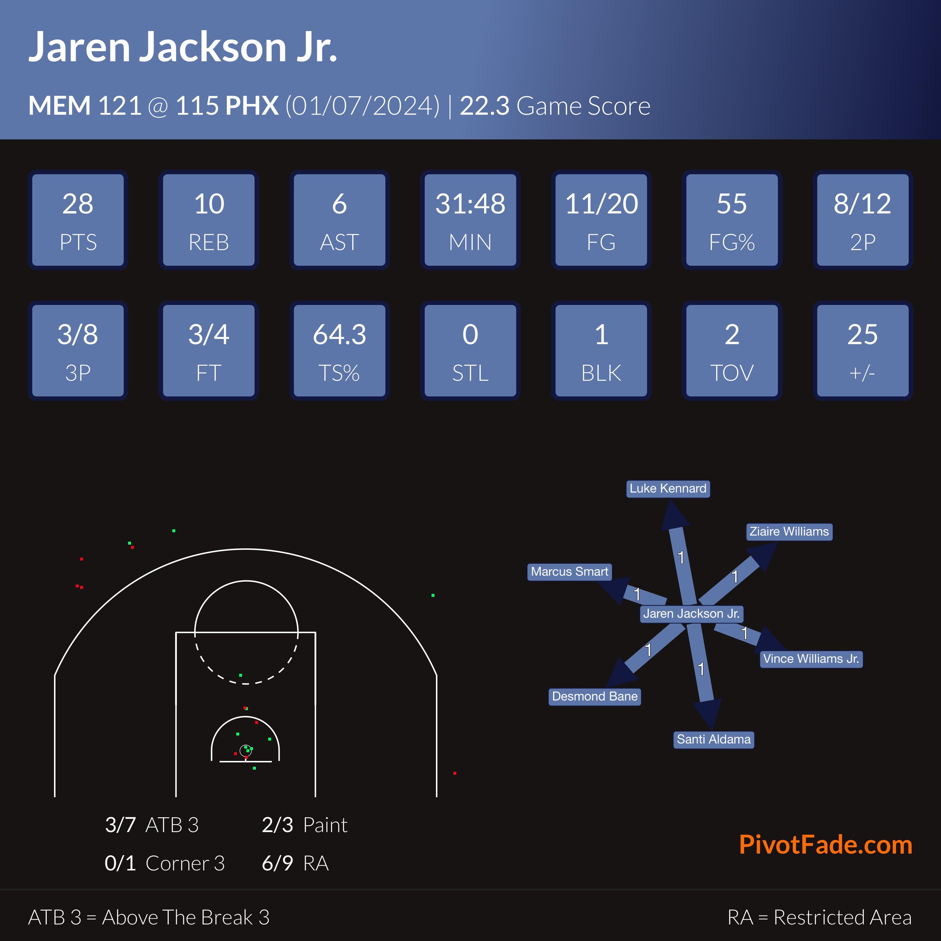 Jaren Jackson Jr. VS Suns by ay_pf Memphis GrizzliesSouthwest DivisionWestern Conference Prev Post Domantas Sabonis on his Kings closing homestand with 33-point loss to Pelicans January 8, 2024 Next Post Phoenix Suns vs Memphis Grizzlies 4th QTR – PART 2 Highlights | Jan 7 | 2024 NBA Regular Season January 8, 2024 2 Comments ay_pf 2 years ago 28 Points (10 in the 4th) 10 Rebounds 6 Assists (all different teammates) +25 Graphic and stats from [PivotFade.com](https://pivotfade.com/game/2982/player/375) Yinanization 2 years ago +25?!!! Write A CommentYou must be logged in to post a comment.