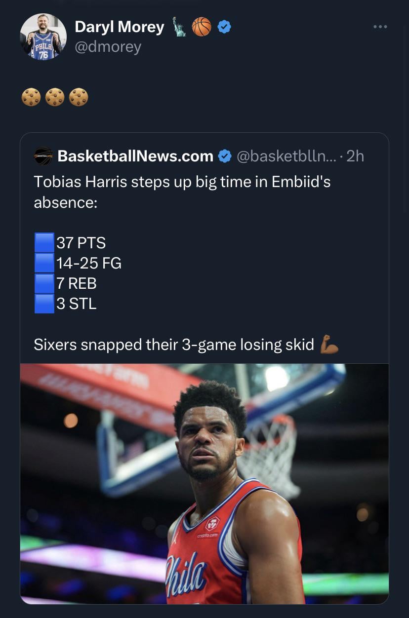Morey doing a little trollingby Alex_Phillips_ Atlantic DivisionEastern ConferencePhiladelphia 76ers Prev Post Game Recap: Heat 99, Magic 96 January 13, 2024 Next Post Game Recap: Clippers 128, Grizzlies 119 January 13, 2024 15 Comments Alex_Phillips_ 2 years ago This man is never getting traded 😠Timmeh_Timbo 2 years ago Cool to see him having fun with it. Daryl’s a smart guy if there is a solid return for tradin Tobi he’ll do it otherwise I think he knows he’ll be able to get him on a much more beneficial contract. Let him cook Alex_Phillips_ 2 years ago [Context](https://youtube.com/shorts/a1slqGdQ4G4?si=CIobRidKqMEmoyD8) EducationalStill3393 2 years ago Meanwhile he is calling Danny Ainge telling him Tobias Harris is untouchable. As untouchable as Lauri Markkanen. PHLANYC 2 years ago I’d trade Tobias to Cleveland today for Serena Winters straight up. eaglesphan1 2 years ago Boosting that trade value baby. Gimme Lauri Active-Beach-8897 2 years ago Daryl trolley iwishiwasntthisway 2 years ago He will never make this sub happy no matter what he does mberko21 2 years ago Most annoying gm in the league Calcutta637 2 years ago I fucking love morey and I love that he hates you MaterialCat5952 2 years ago He can troll all he wants being a fat troll on Twitter won’t win us a championship or get us to the eastern conference finals. RichieD79 2 years ago Sell high, baby! IndominusCostanza009 2 years ago I’d rather have the cookies than a player that gets paid enough to do this every night, but only does it bimonthly. ShaunyDukes 2 years ago We are doomed FRED44444 2 years ago Shut the fuck up moreyWrite A CommentYou must be logged in to post a comment.