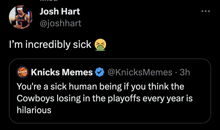 Josh Hart laughing at the Cowboys’ demise by SwellandDecay Atlantic DivisionEastern ConferenceNew York Knicks Prev Post Bam Adebayo Has Been Hooping These Last 5 Games 🔥 January 15, 2024 Next Post The Pistons Pulse: Trade Deadline Primer with Keith Smith January 15, 2024 2 Comments Crimson_Shin 2 years ago Someone call me an ambulance! MYO716 2 years ago What’s a Knicks page doing simping for the Cowboys?Write A CommentYou must be logged in to post a comment.