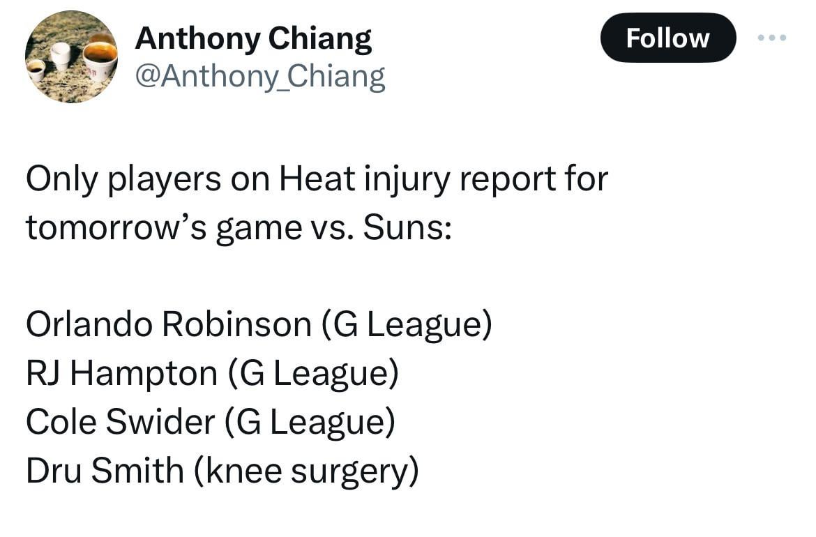 Full Squad (Mostly) ✅ by DMD612 Eastern ConferenceMiami HeatSoutheast Division Prev Post George Karl wishes Andre “The Mole” Iguodala a happy 40th birthday January 28, 2024 Next Post Chet Holmgren 9 pts 12 reb 1 ast vs Detroit Pistons | 2024-01-28 January 28, 2024 8 Comments Flaky-Mathematician8 2 years ago The Suns coming off a back to back tomorrow we should be able to get back to win column tomorrow OblivionNA 2 years ago Nothing about the fully healthy team has shown me we can actually win right now. I’d love to be surprised though Dame2Miami 2 years ago Did Dru Smith ever get his settlement money? EdboiDecoi 2 years ago The Zombie Heat begin their terror tomorrow watch.Just when everyone thought we were dead… dr_ally 2 years ago Jamal Cain 30 b*mb Seref15 2 years ago We’ve played worse the healthier we are lol Ode1st 2 years ago Can’t wait to lose by 30 🙁 039jmunna 2 years ago Man I would like to see Orob and swider get some play time broWrite A CommentYou must be logged in to post a comment.