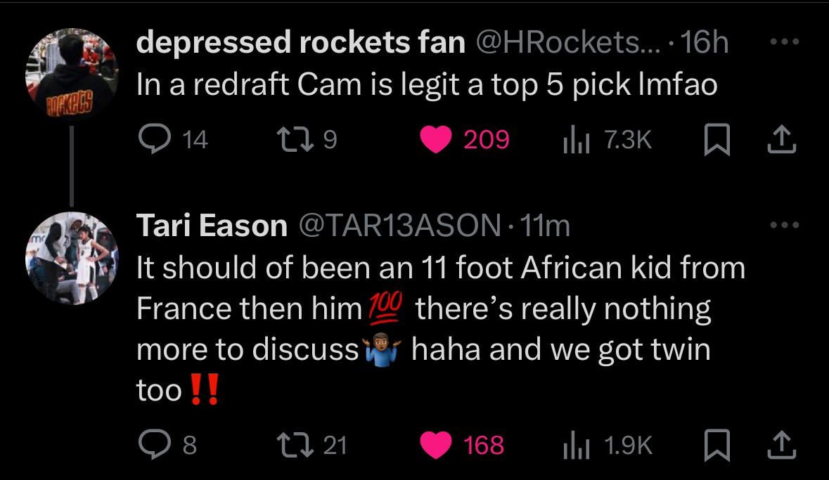 https://x.com/tar13ason/status/1752417461771567430 by ST012Mi Houston RocketsSouthwest DivisionWestern Conference Prev Post EPM Data on Contracts (Underperform / Outperform) January 30, 2024 Next Post I’m a Clippers fan but i like Ben Simmons and the Nets in general. i just wanted to let yall know that yall got a nice team January 30, 2024 4 Comments JaTari_Wemba 2 years ago Like I said pretend Cam was the 4th pick and Amen the 19th pick for this season. IronicHours 2 years ago Tari knows ball. The Thompson twins are going to be the death of non shooting guards in upcoming drafts. Even Scoot has been ass frankievejle 2 years ago  Amen is sat there like GoatProfessional4389 2 years ago Yet he’s not playing in the ROOKIE GAME Write A CommentYou must be logged in to post a comment.