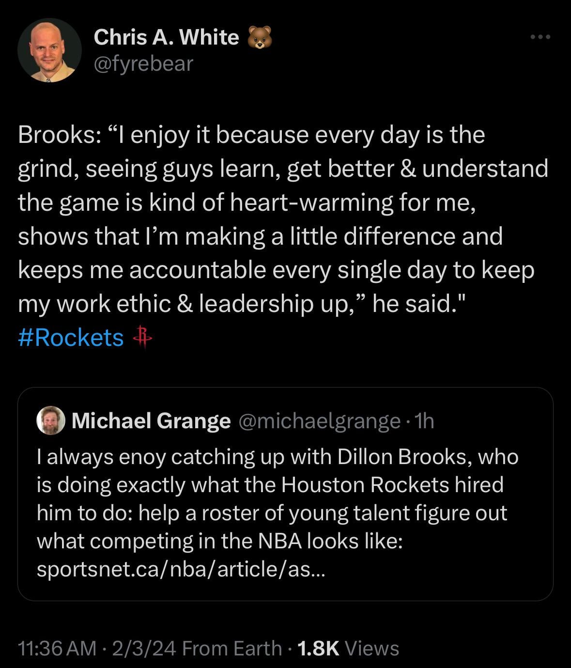 https://x.com/fyrebear/status/1753865105886908775by ST012Mi Houston RocketsSouthwest DivisionWestern Conference Prev Post The Ultimate Pelicans Team… Kinda February 3, 2024 Next Post Charlotte Hornets / Bobcats / Hornets Again Jersey Mural Real Life February 3, 2024 1 Comment htownballa1 2 years ago This is why I was so on board with his signing.“Brooks will be huge for our young guys, even if he commits some dumb fouls.”Write A CommentYou must be logged in to post a comment.