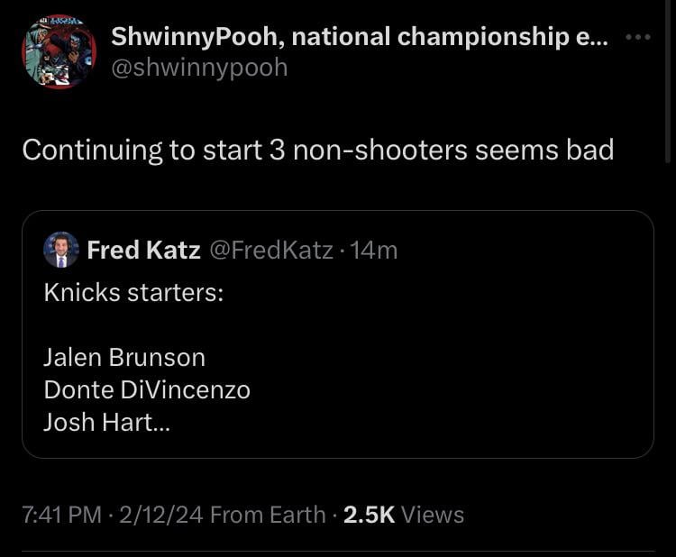 I worry about this as well. Might at some point put Burks at the 3 or Bojan at 4 by Nyfan7 Atlantic DivisionEastern ConferenceNew York Knicks Prev Post Coby White, Chicago Bulls square off against Trae Young, Hawks | CHGO Bulls Podcast February 13, 2024 Next Post [Highlight] Donovan Mitchell crosses up Kelly Oubre Jr and drains the three February 13, 2024 Write A CommentYou must be logged in to post a comment.