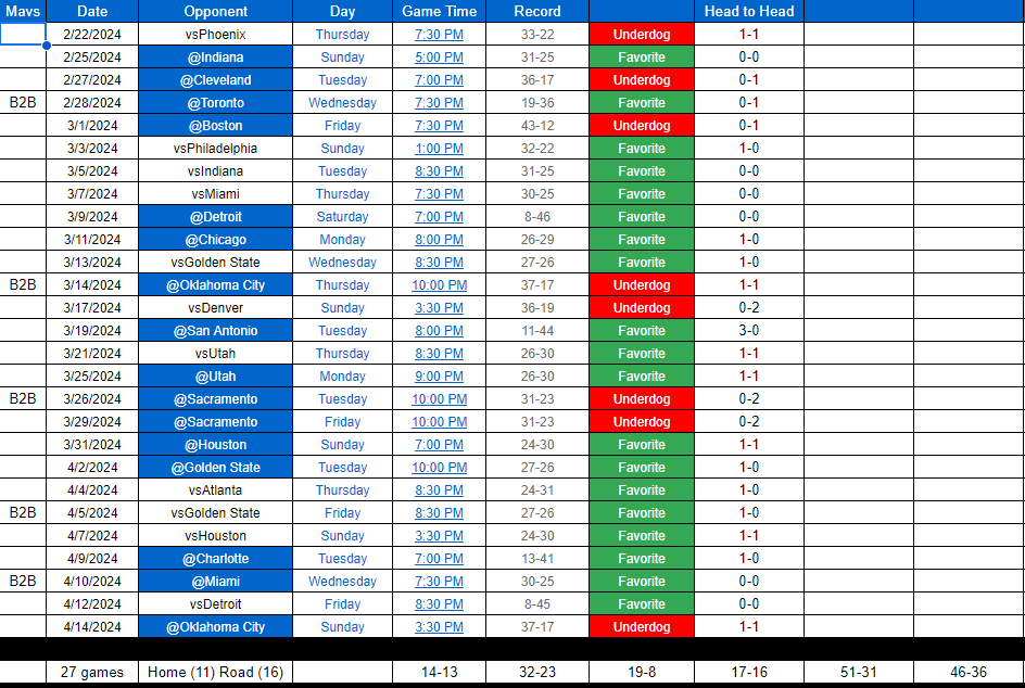 1. 4 game East road trip 2/25 – 03/01 against (Indiana, Cleveland, Toronto, Boston) 2. 5 game West road trip 3/25 – 04/02 against (Utah, Sacramento, Sacramento, Houston, Golden State) 3. 5 back to backs left (Toronto, Oklahoma City, Sacramento, Golden State, Miami)