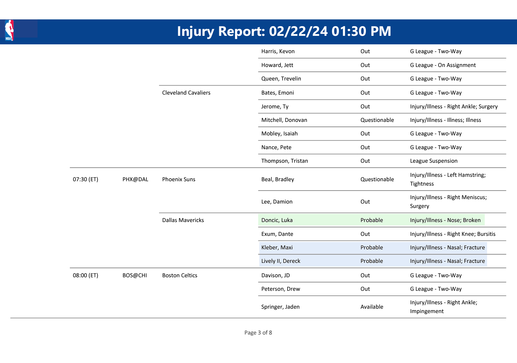 [Injury report ahead of Suns’ game] Exum out. Lively and Maxi probable despite their “Nasal; Fracture[s]”, Luka probable despite his “Nose; Broken”. by sercialinho Dallas MavericksSouthwest DivisionWestern Conference Prev Post 🚨 BIG 76ers Injury News Ft. Joel Embiid, Tobias Harris, De’Anthony Melton, Batum, Lowry & Covington February 22, 2024 Next Post Why are TV ratings down for the Cleveland Cavaliers this season? February 22, 2024 7 Comments OrganicHunt952 2 years ago Did Luka have surgery or na? MaleficentHawk590 2 years ago God damn, what is up with all the nose injuries this year? sinik_ko 2 years ago Dwight Powell would never 😤 mcskim46 2 years ago I’m more concerned about Exum. He’s played in just 2 of the last 21 games and has been out consistently for the past 3 weeks. Zestyclose_Wafer_416 2 years ago We getting masked Luka,? Thought I heard he was getting a fitted one after the ASB warpedspoon 2 years ago when did Luka break his nose? Afraid-Department-35 2 years ago Ain’t no broken noses stopping us!Write A CommentYou must be logged in to post a comment.