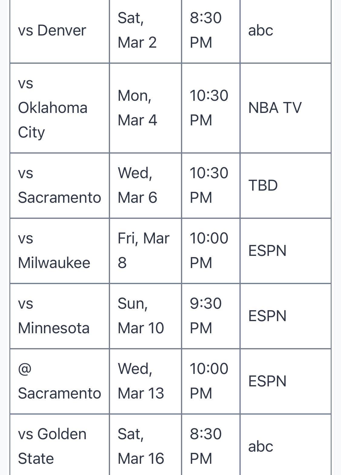 The good news is there no travel involved at all other than going down the street to Sacramento and no back to backs. Should have plenty of rest. But yeah, its a brutal stretch.