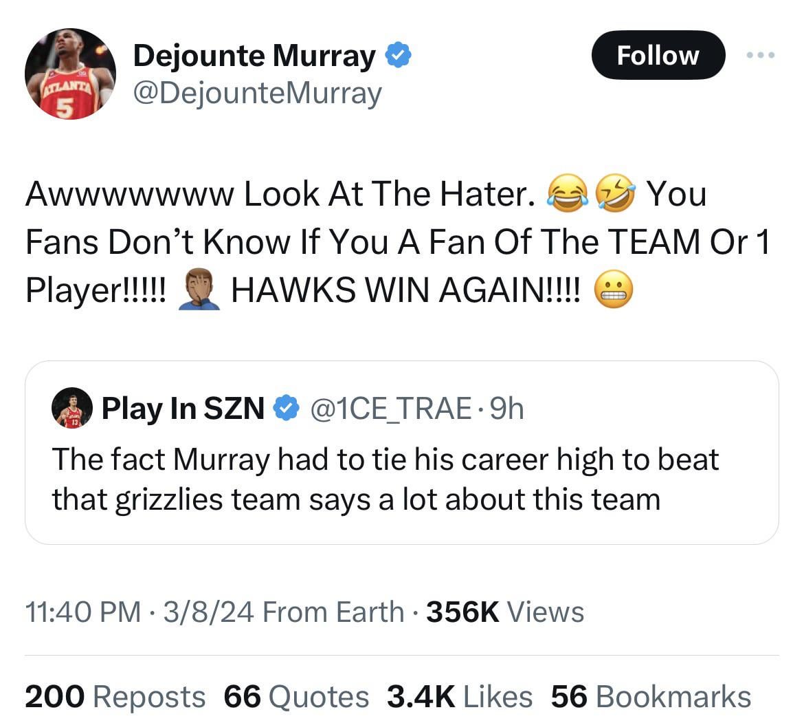 This is a really immature look tbh. Grizzlies are really bad. They have two of their top 10 guys. Yea hawks beat them cuz they were supposed to, at least on the books. Yea DJ had an awesome game but then it’s like you forget the nets games? He made 18 against the cavs where the team won. He made 22 in the nets game where we lost where he disappeared for quarters at a time. Anyway just why do this ? Makes no sense. Take the high road become consistent and if you actually get better than number 10 position say what you want to say.