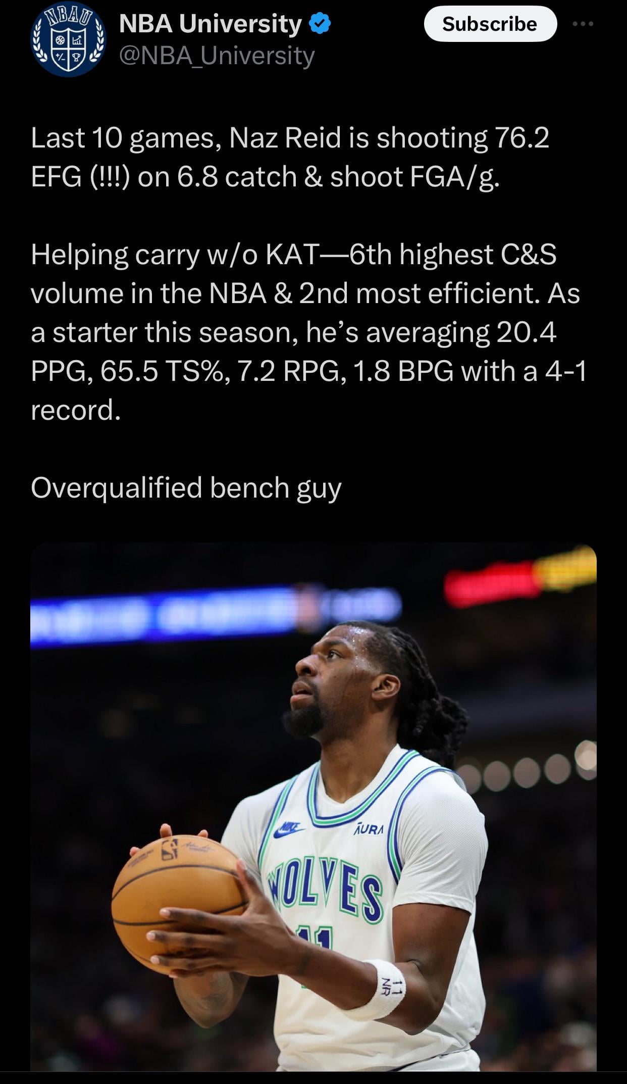 Your daily Naz Reid appreciation post by EngineeringFlashy139 Minnesota TimberwolvesNorthwest DivisionWestern Conference Prev Post LeBron James Says He Closely Tracks Draymond Green’s “Eyes” to Guard Him in the Post, Praises Warriors’ IQ March 27, 2024 Next Post LIVE: Pelicans vs. Thunder Postgame Interviews 3/26/2024 March 27, 2024 5 Comments noname3191 2 years ago Damn, I’m not a kat hater but part of me thinks naz starting and kat off the bench could be game changing DrWolves 2 years ago Best contract in the league Complete-Disaster513 2 years ago So does this help him win 6th man of the year? Formal_Junket_1585 2 years ago Does anyone know the avg minutes he plays when he starts? He’s avg an efficient 20 and hes only played 30+ min 3 times since kat got hurt HeyZeus2720 2 years ago Naz ReidWrite A CommentYou must be logged in to post a comment.