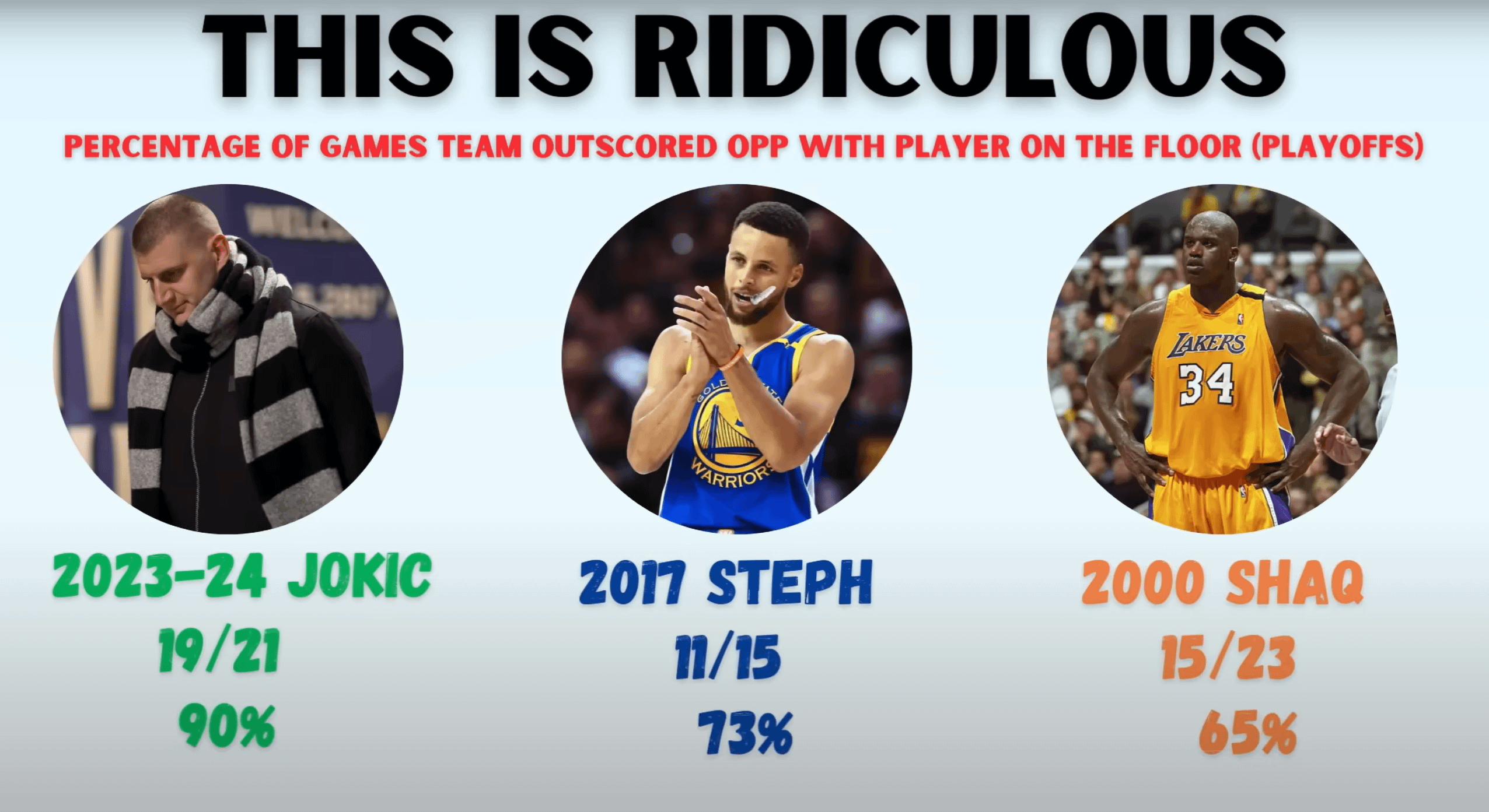 [6Man] The Nuggets outscore their playoff opponents while Jokic is on the floor at higher rates than peak Curry or Shaq.by LurkerFailsLurking Denver NuggetsNorthwest DivisionWestern Conference Prev Post just posted my first youtube video 😎 show some love if you guys like it 🐜🐜🐜 April 22, 2024 Next Post [Automaticnba] Top 30 shooters statistically this season. Here we’re combining volume and efficiency of 4 major shooting categories to get an overall “shooting PTS Added April 22, 2024 1 Comment LurkerFailsLurking 2 years ago Source: [https://www.youtube.com/watch?v=UHDKvy-KKIw](https://www.youtube.com/watch?v=UHDKvy-KKIw)Write A CommentYou must be logged in to post a comment.