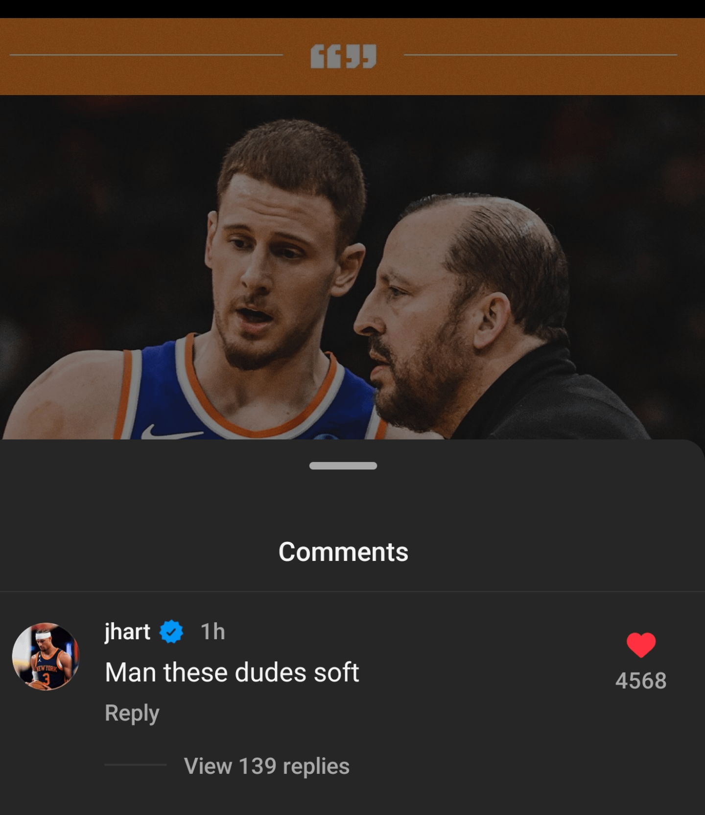 How can you not love Josh Hart. [Gotta be a soft ass fan to hate on this man](https://www.reddit.com/r/NYKnicks/s/r9JiFipG7t)